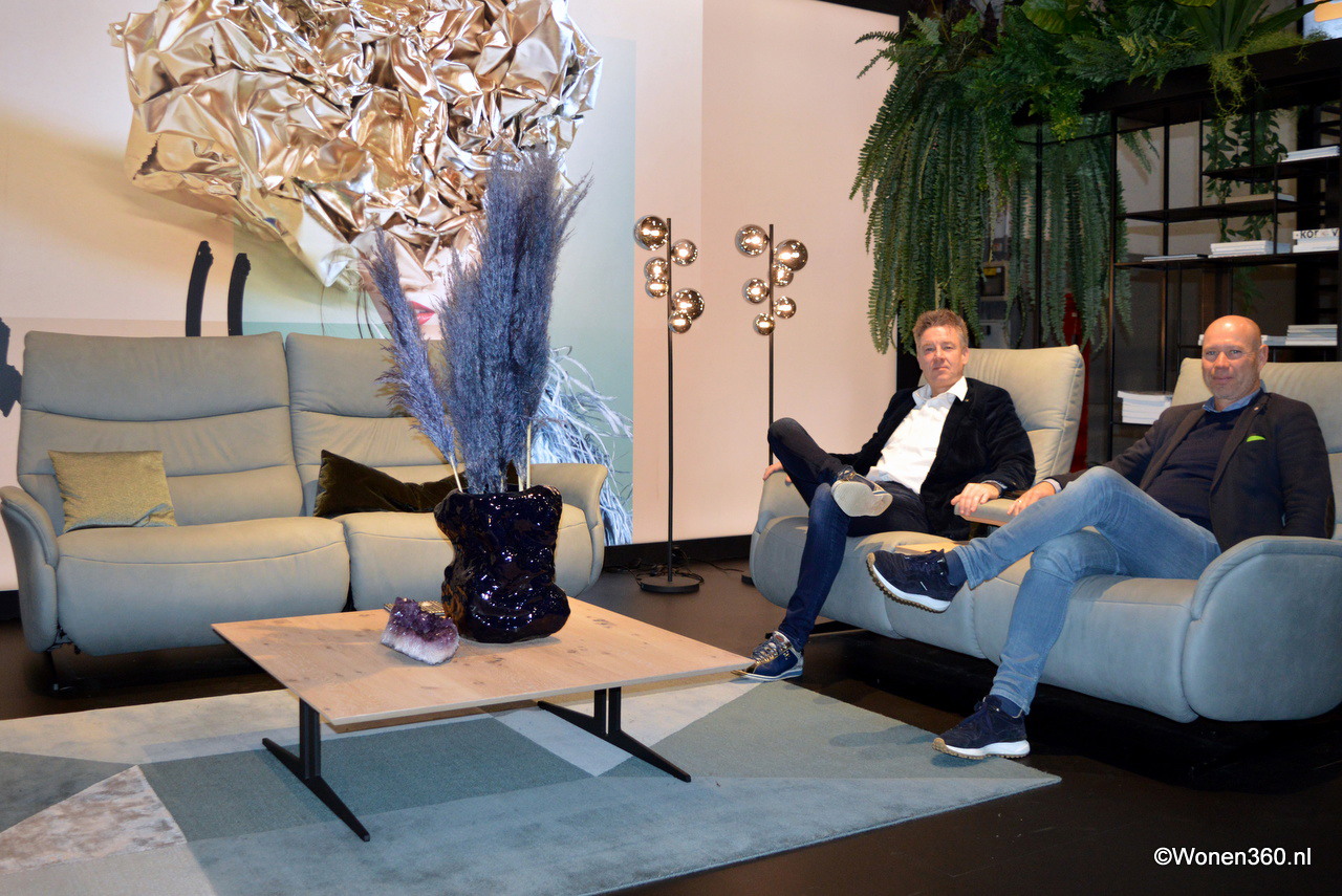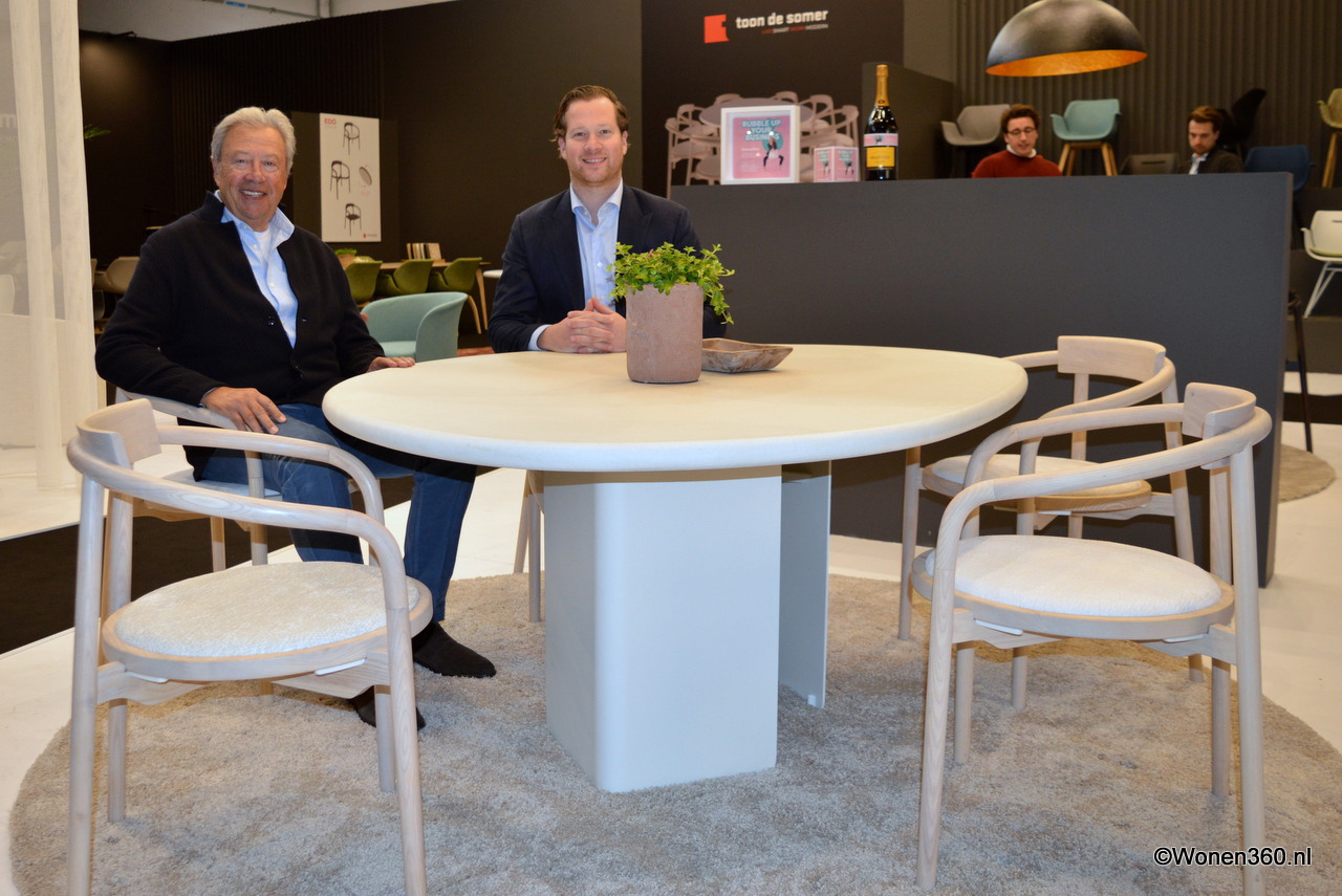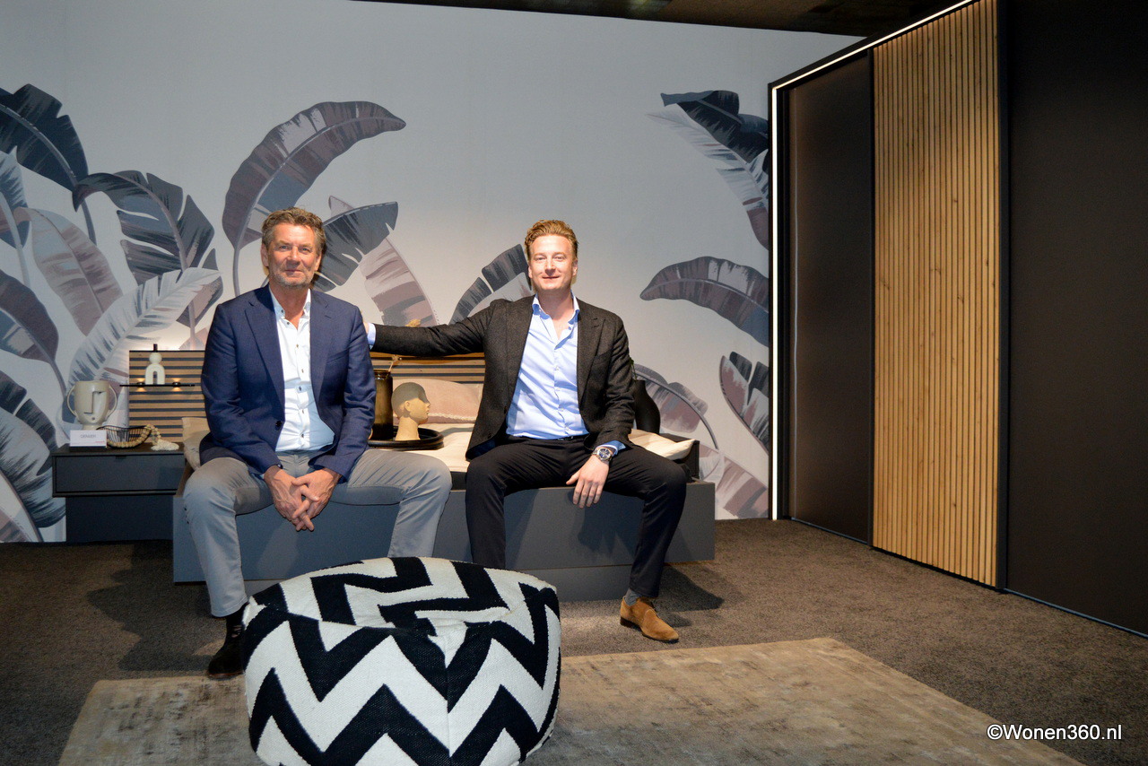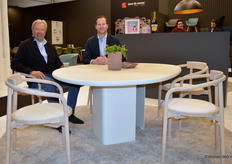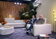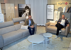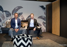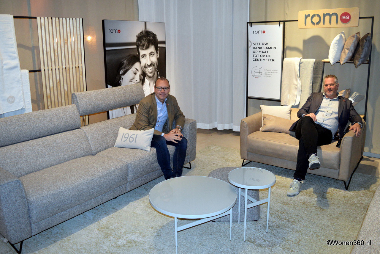 Andreas Knippert en Huib Heldens in de vernieuwde stand van zitmeubelfabrikant ROM. Links is het zevende model uit de Rom1961 collectie te zien: De Matheo.