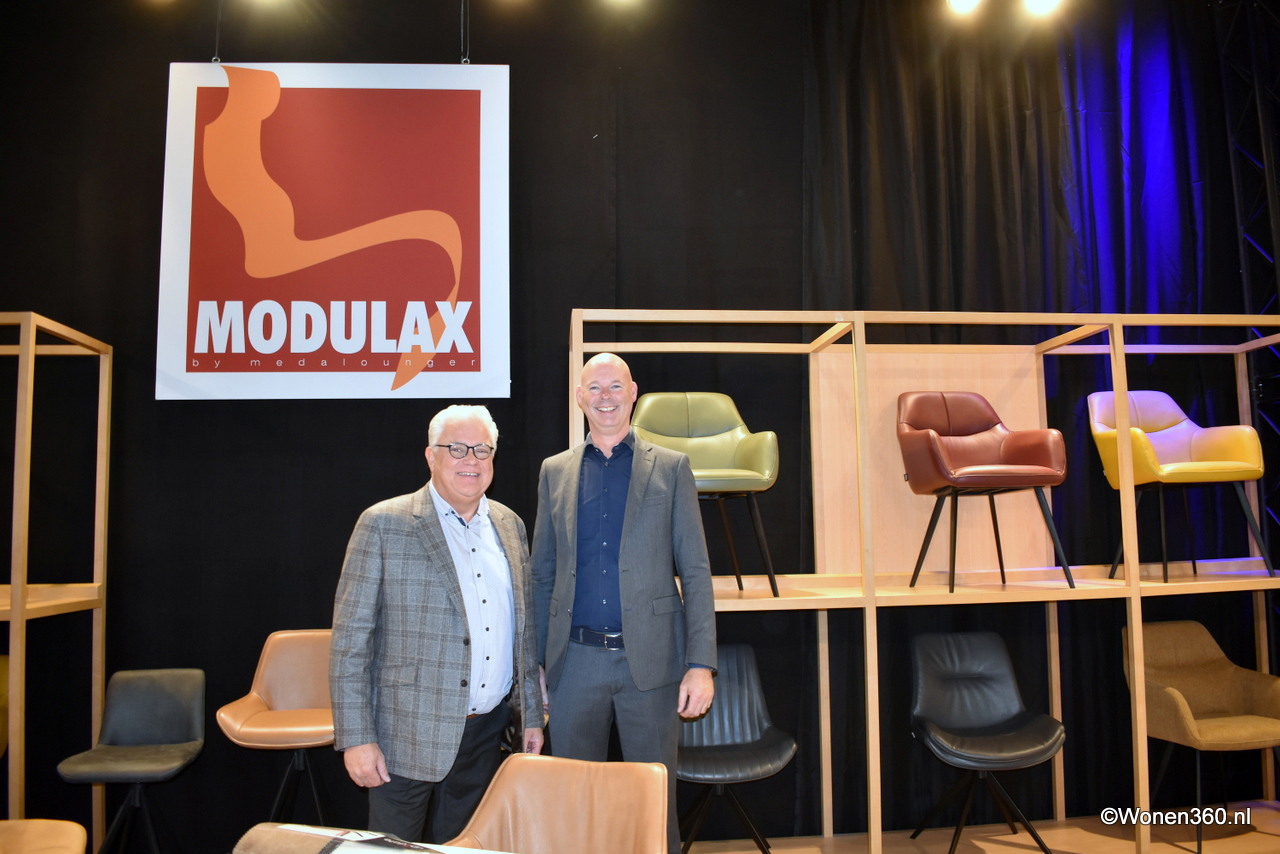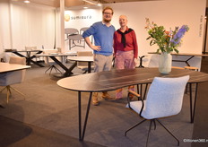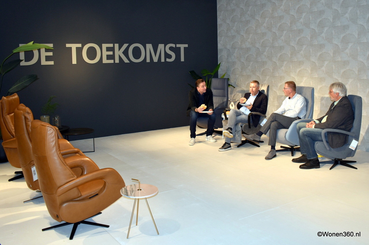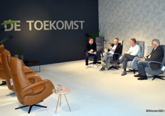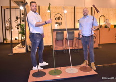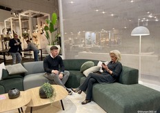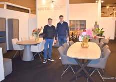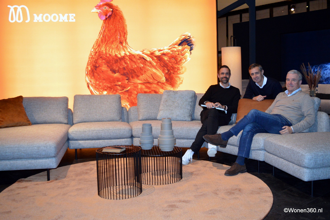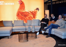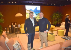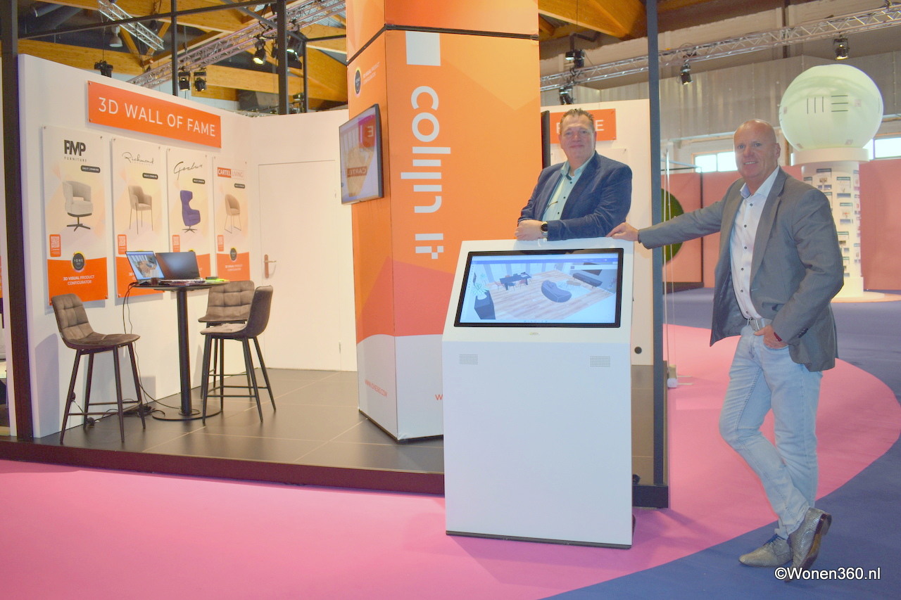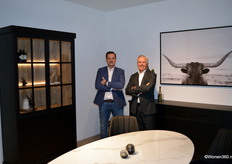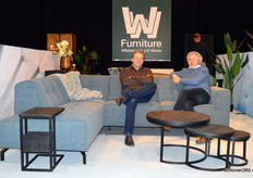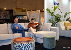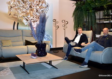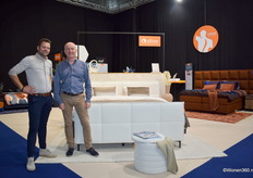 Andreas Knippert en Huib Heldens in de vernieuwde stand van zitmeubelfabrikant ROM. Links is het zevende model uit de Rom1961 collectie te zien: De Matheo.
