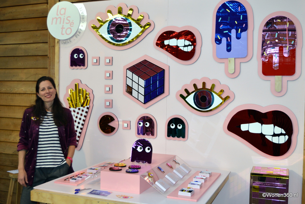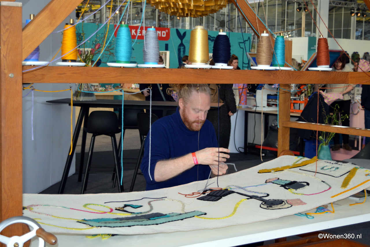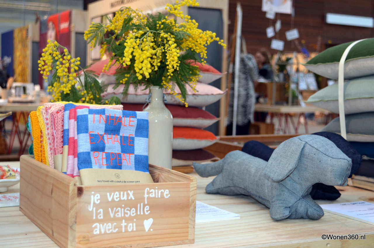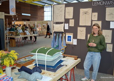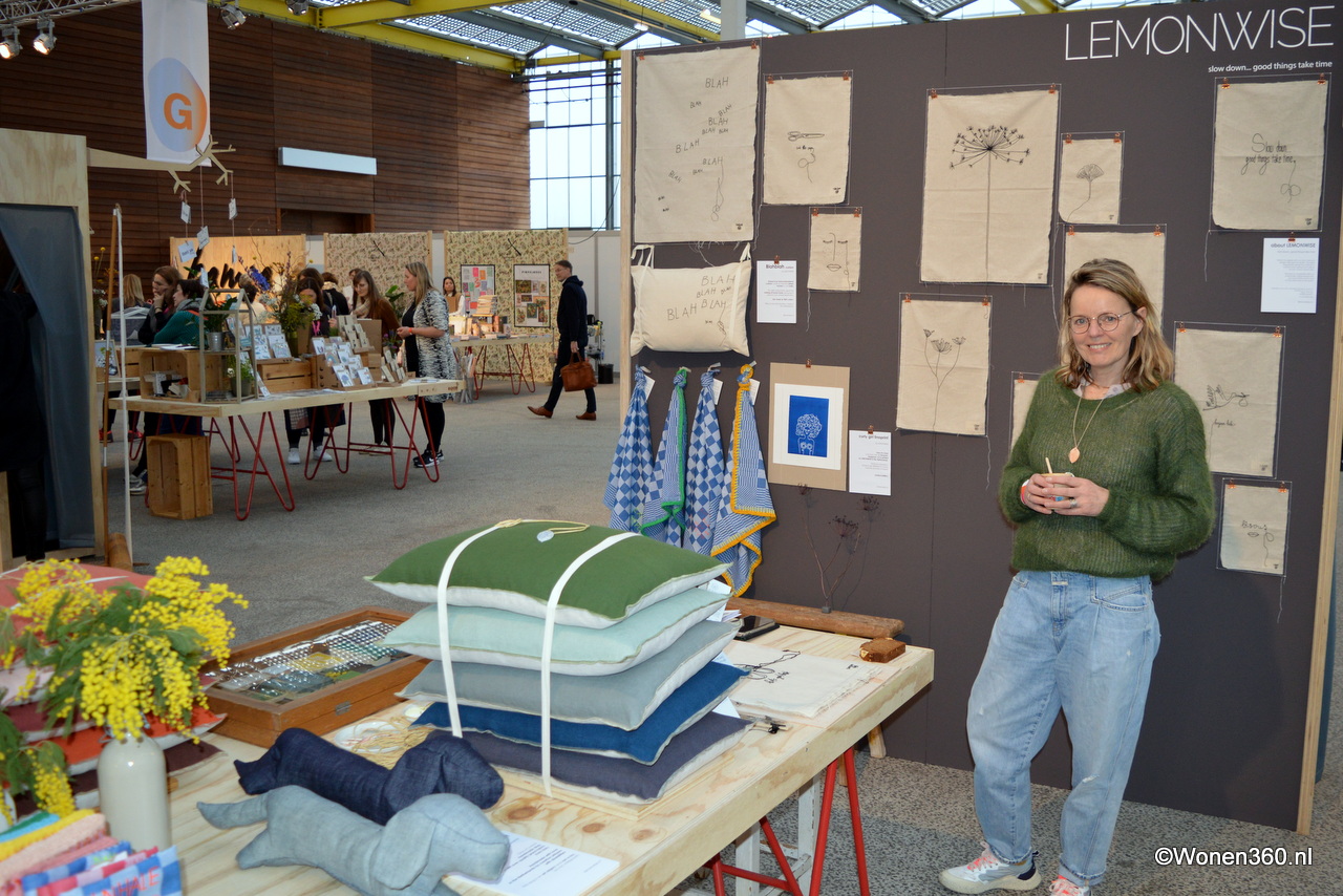 Achter Karen Vollmuller is de stitched art collectie te zien. De handgemaakte producten zijn herkenbaar door het Lemonwise handschrift.