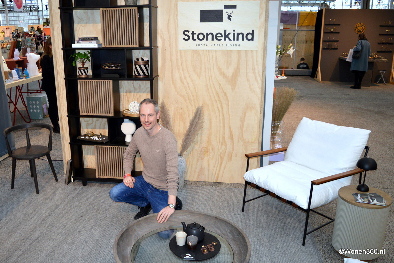 Voor Stonekind was het de eerste beurs in de geschiedenis van het jonge meubelbedrijf. Geart Klooster, vertegenwoordiger Nederland, legt uit dat de collectie geïnspireerd is op de hedendaagse Japandi designstijl.
