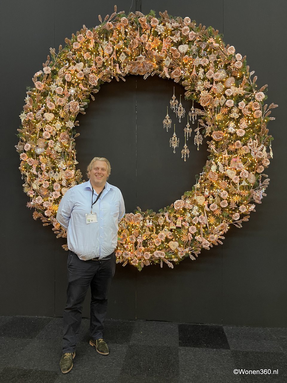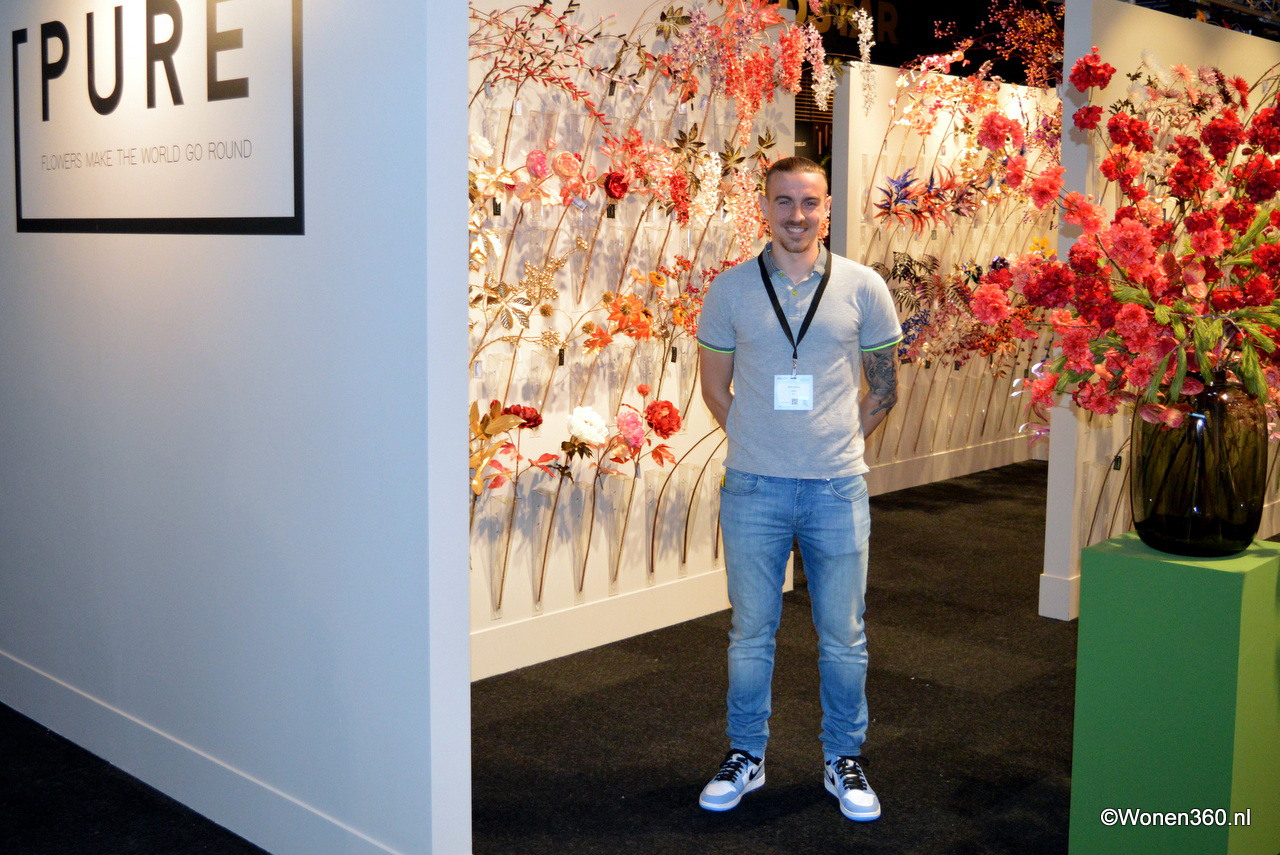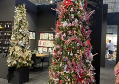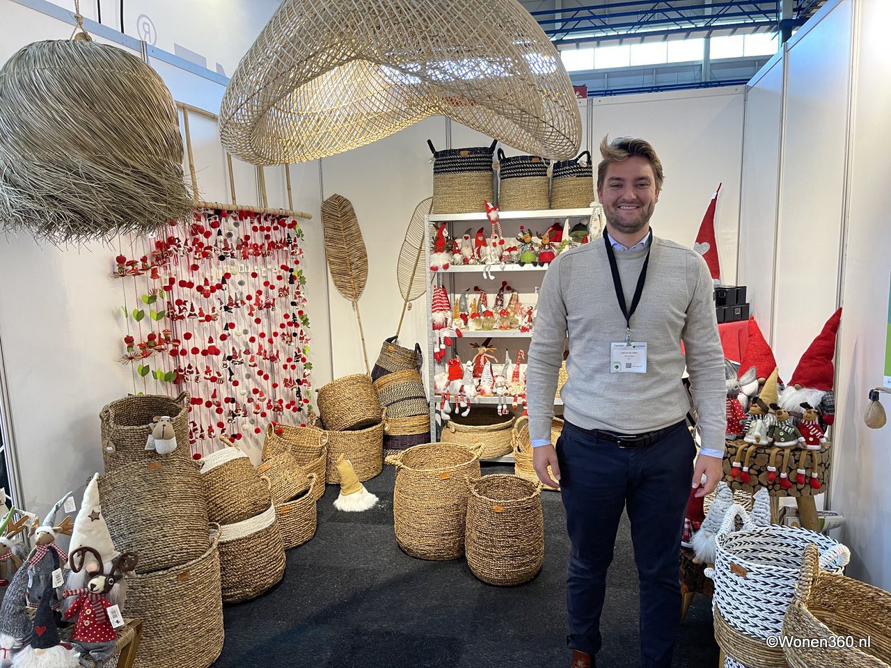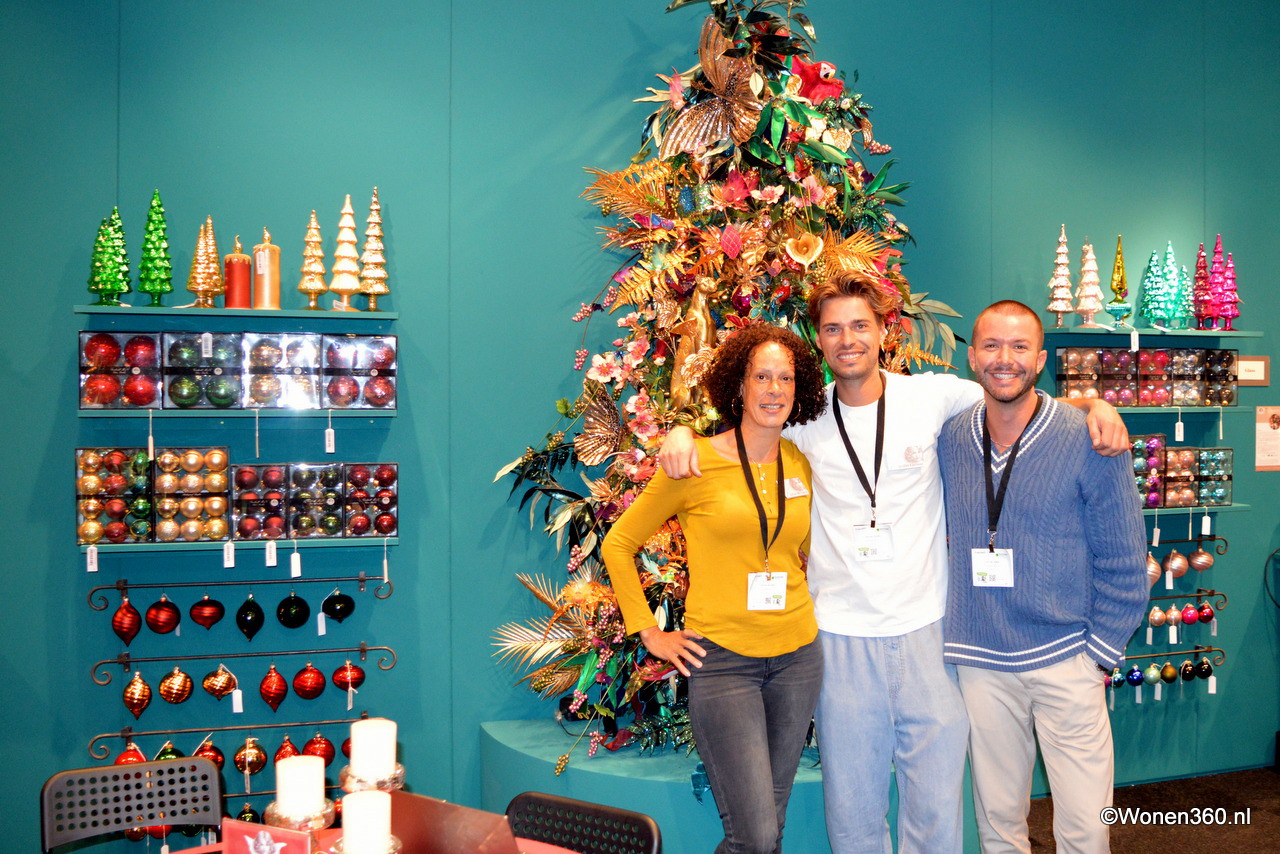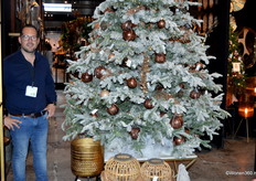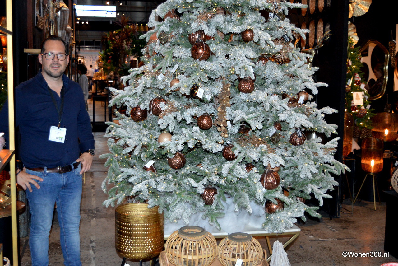 Een grote witte kerstboom vol nieuwe kerstdecoratie pronkt naast Joost van der Vlugt op de stand van Mansion Atmosphere.