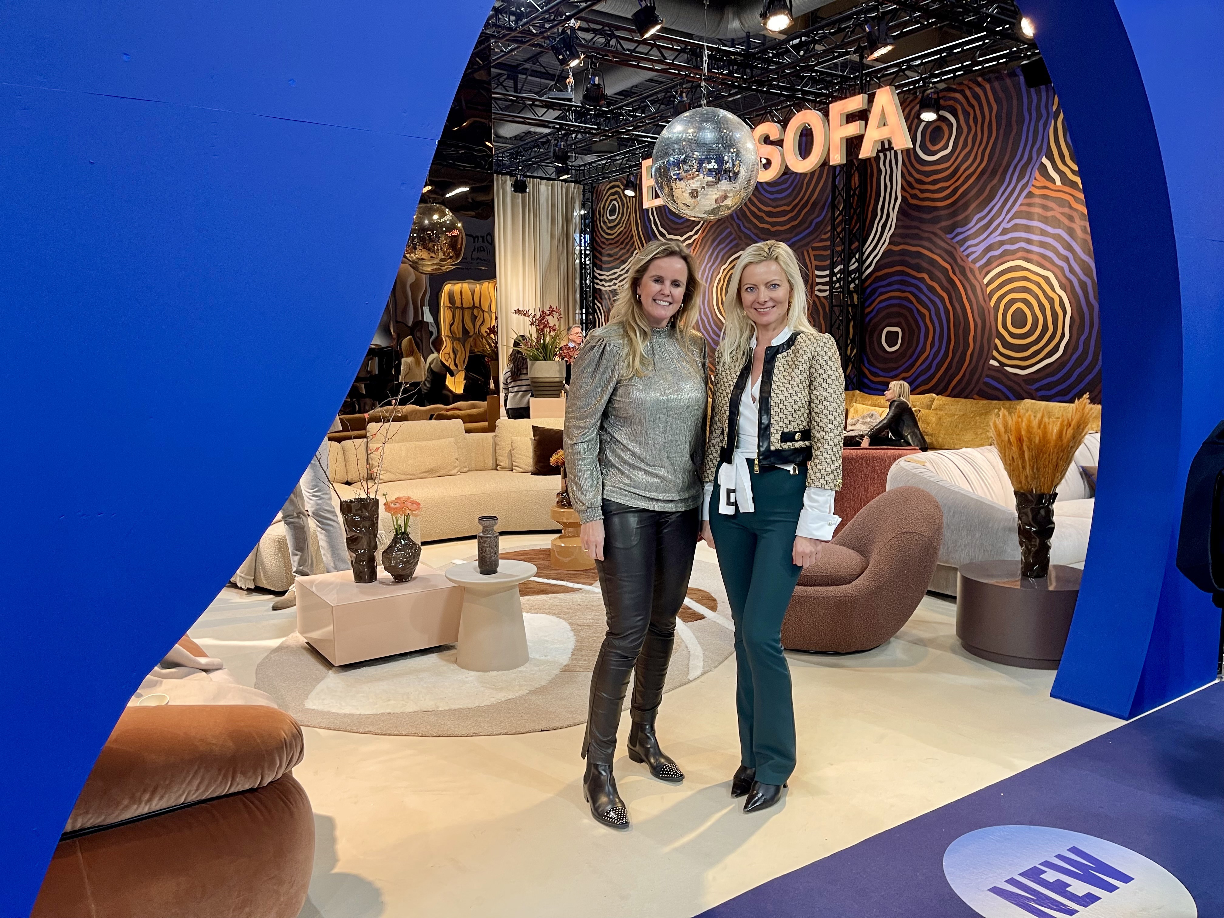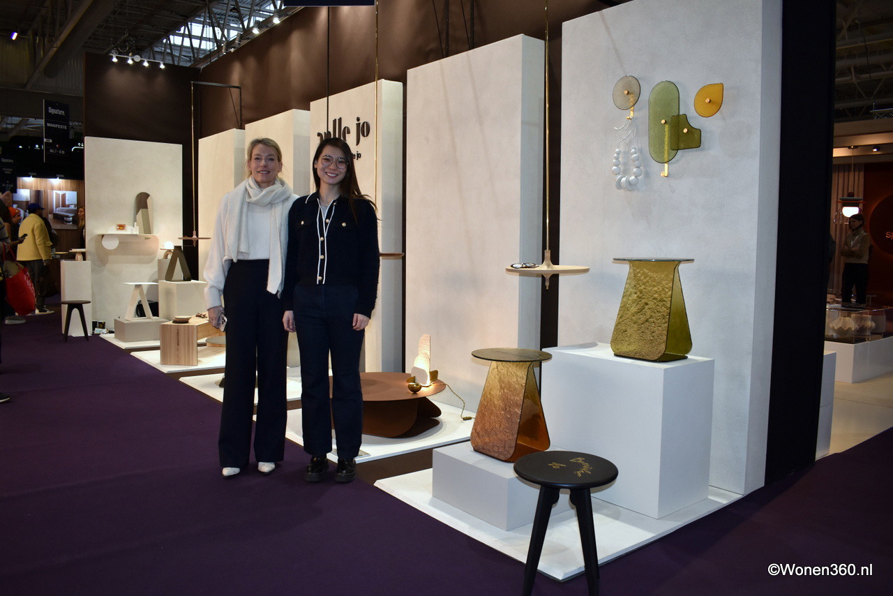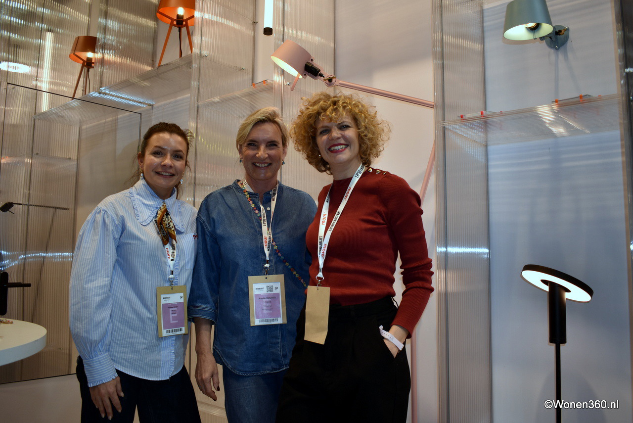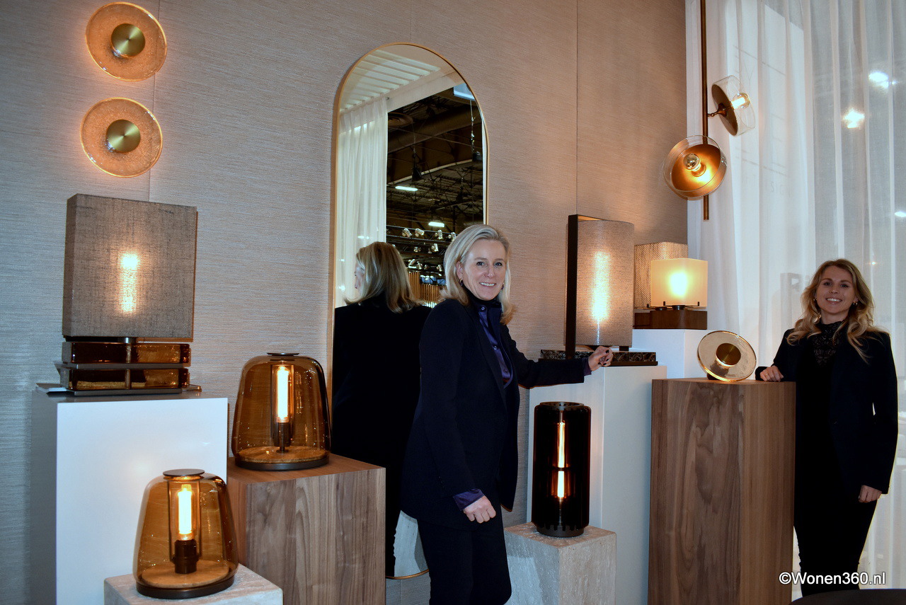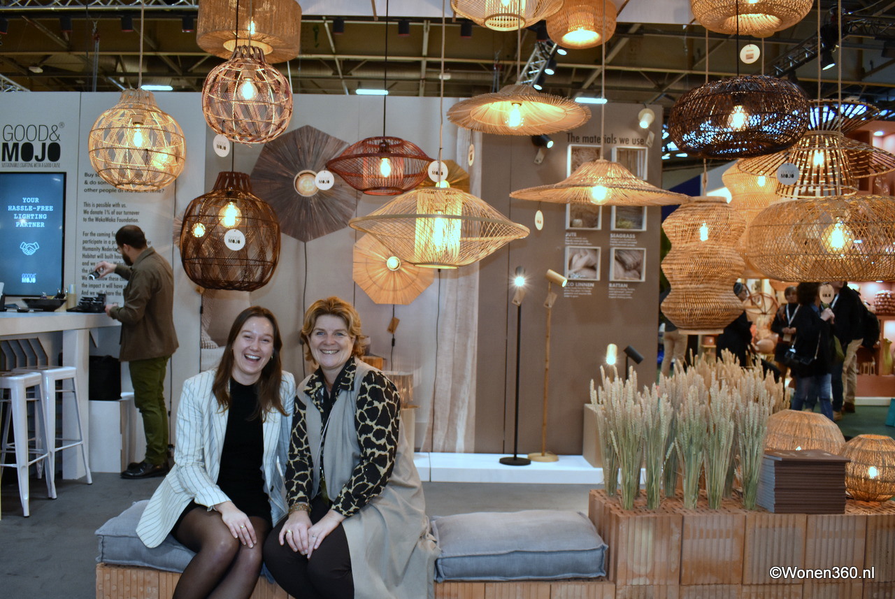 Dunja Wierema en Louise Nolta in de stand van It’s About Romi van GOOD&MOJO, poserend bij de nieuwe collectie lampen gemaakt van duurzame materialen.