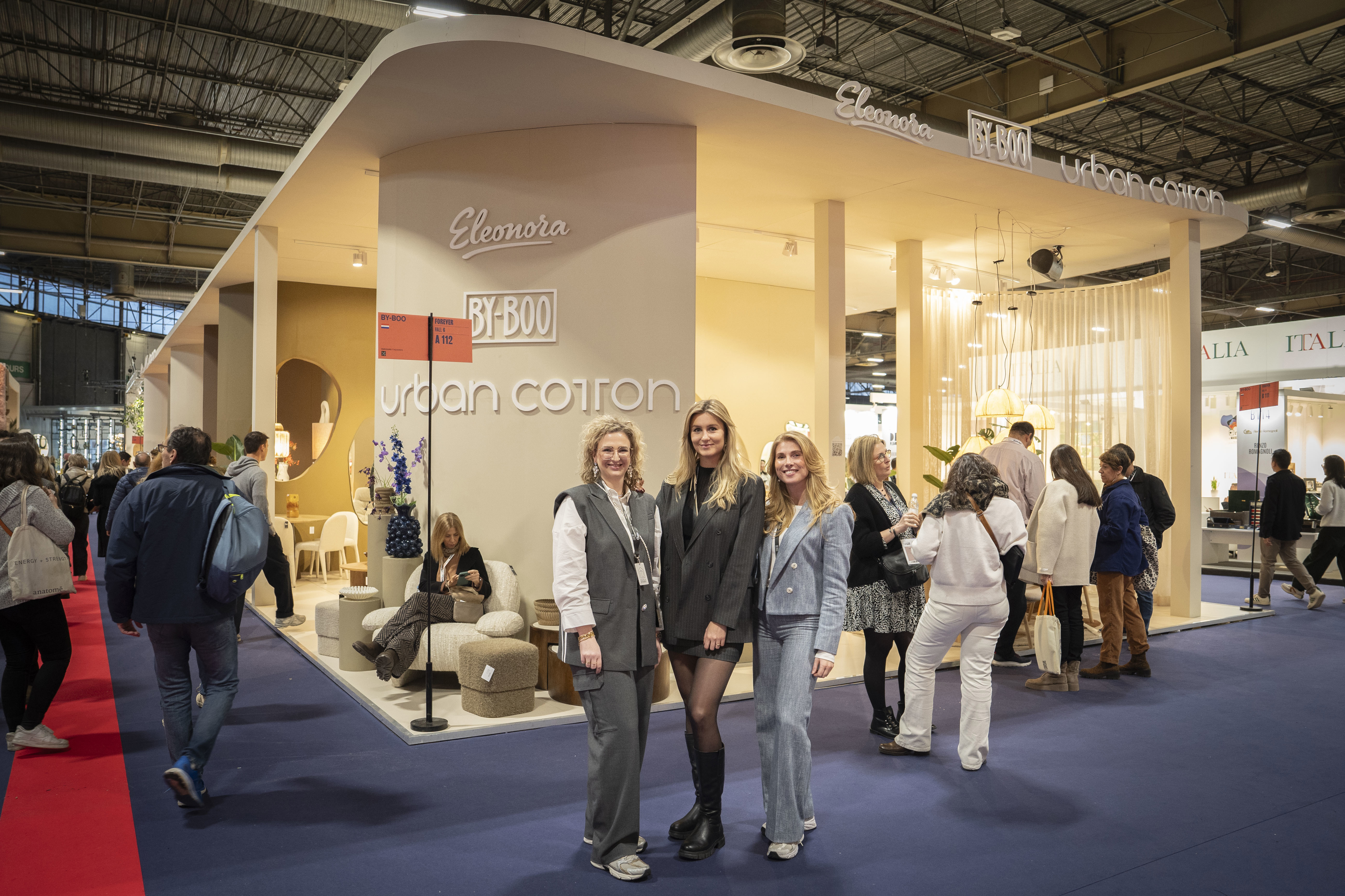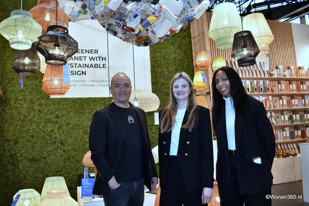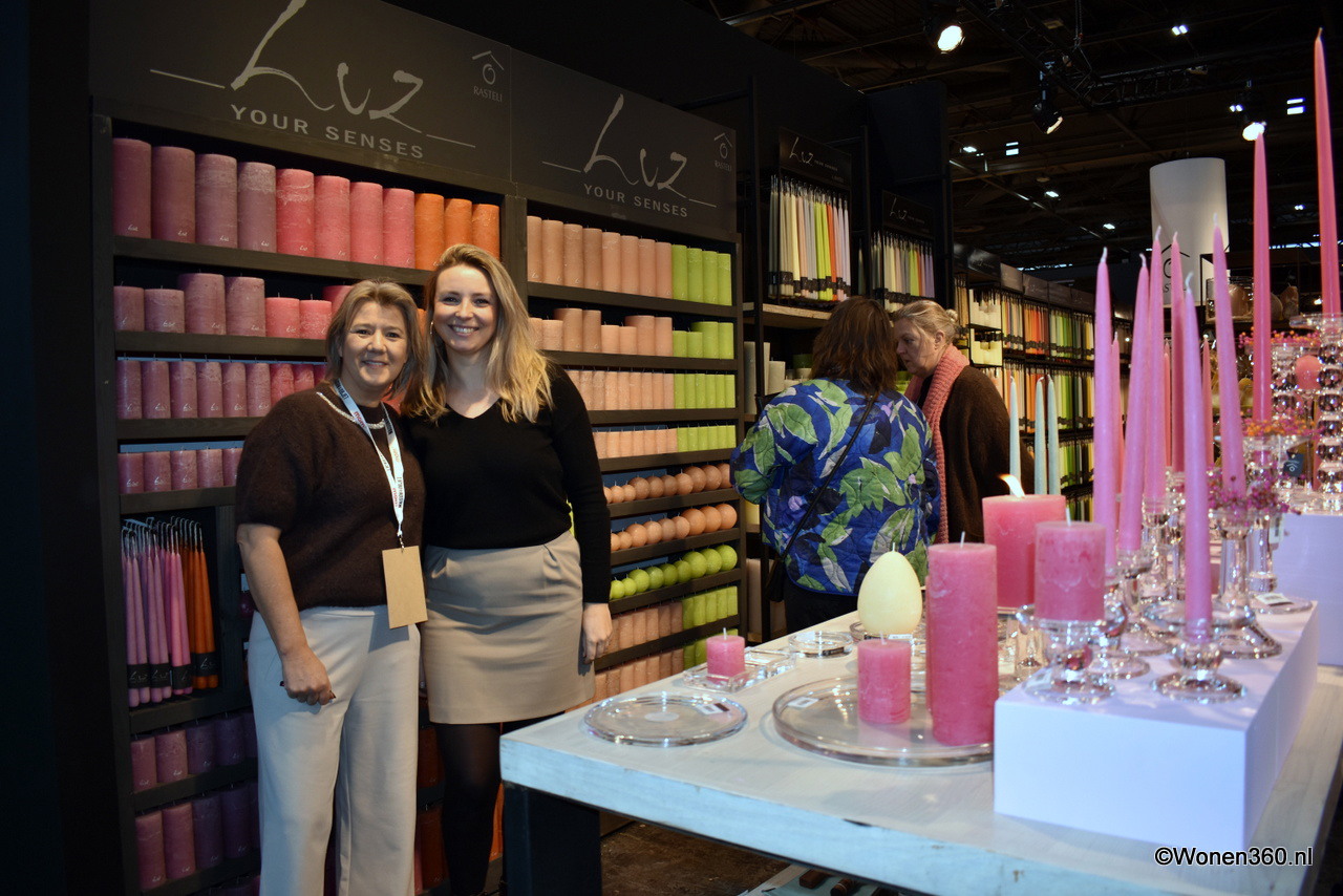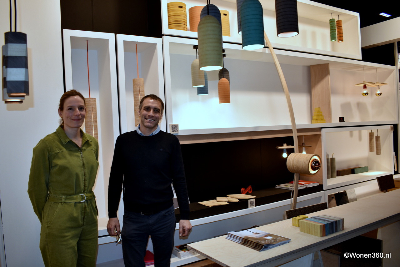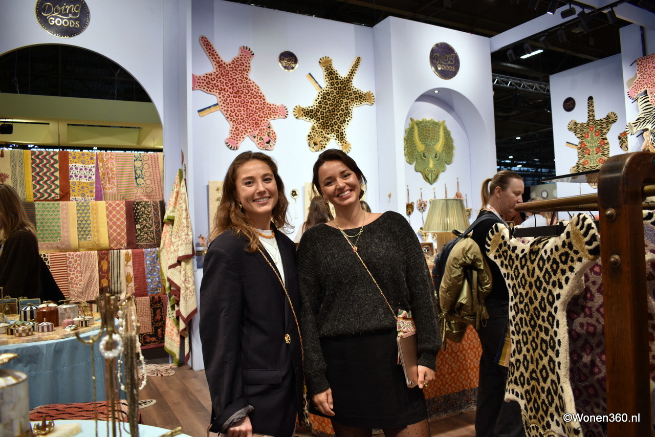 Dunja Wierema en Louise Nolta in de stand van It’s About Romi van GOOD&MOJO, poserend bij de nieuwe collectie lampen gemaakt van duurzame materialen.