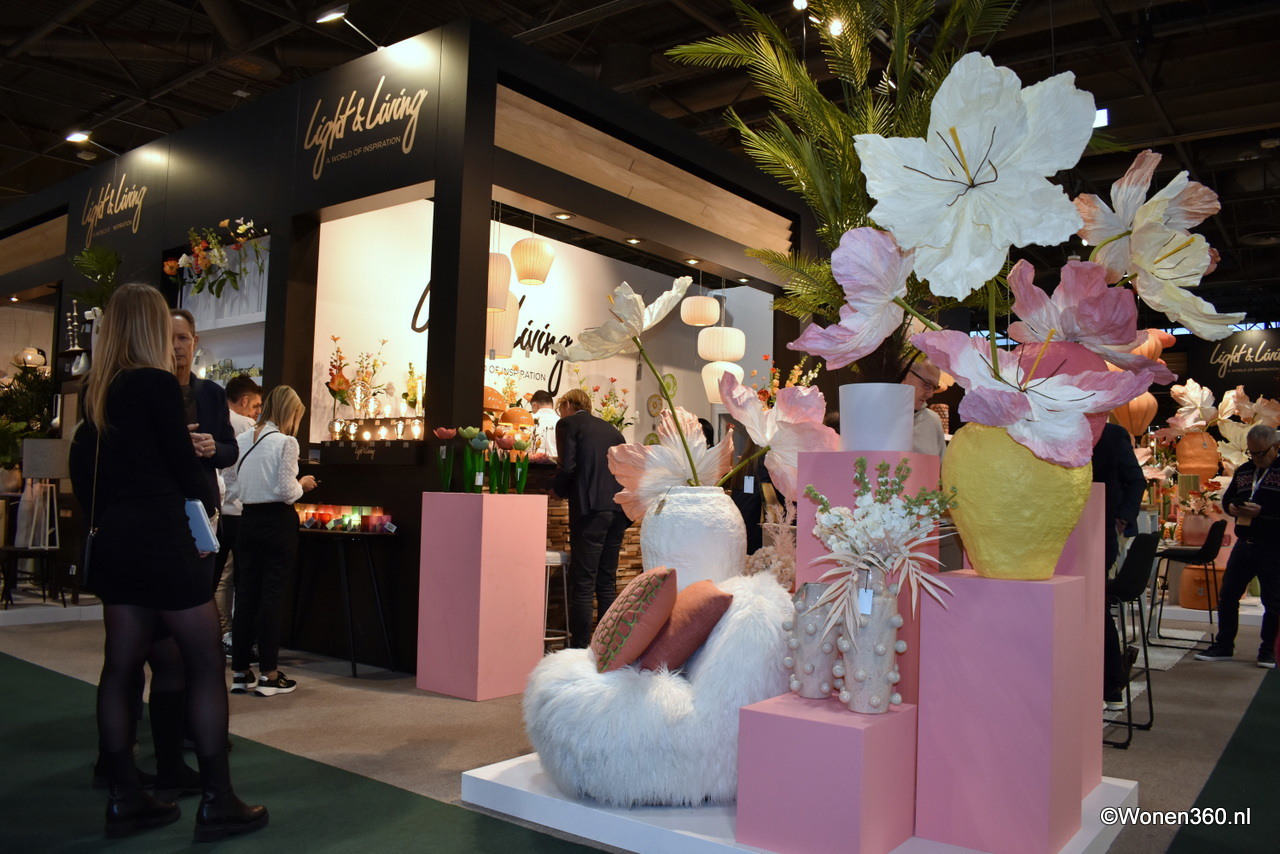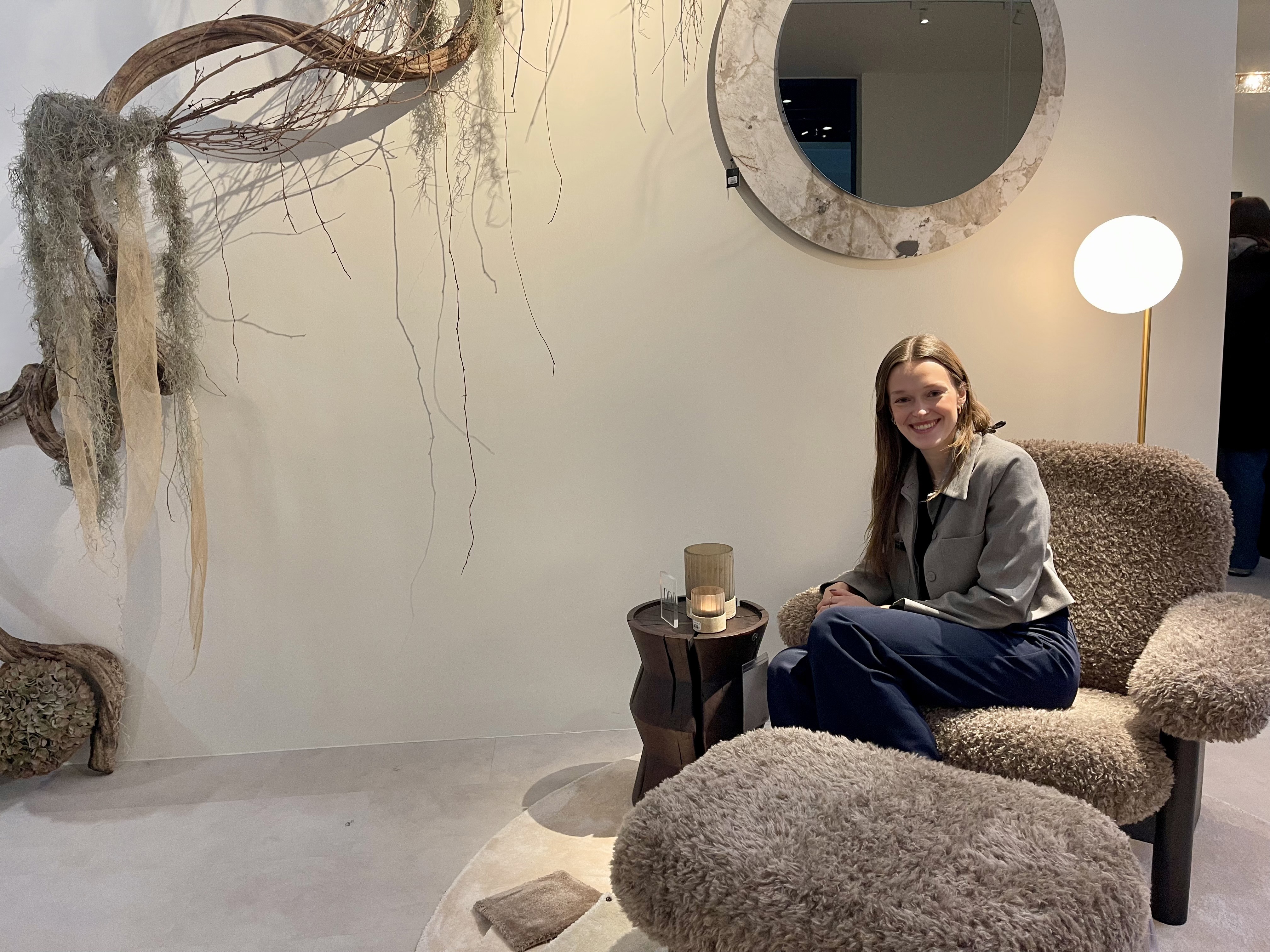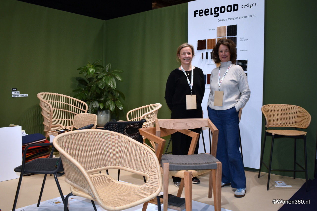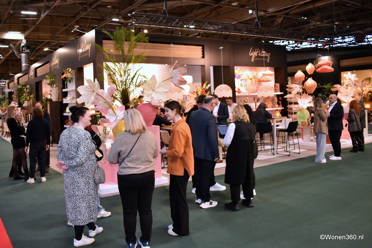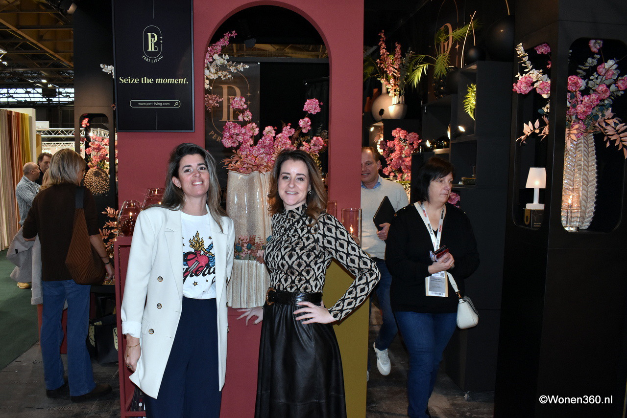 Dunja Wierema en Louise Nolta in de stand van It’s About Romi van GOOD&MOJO, poserend bij de nieuwe collectie lampen gemaakt van duurzame materialen.