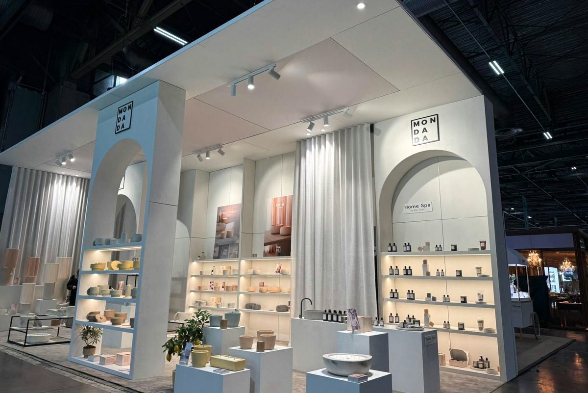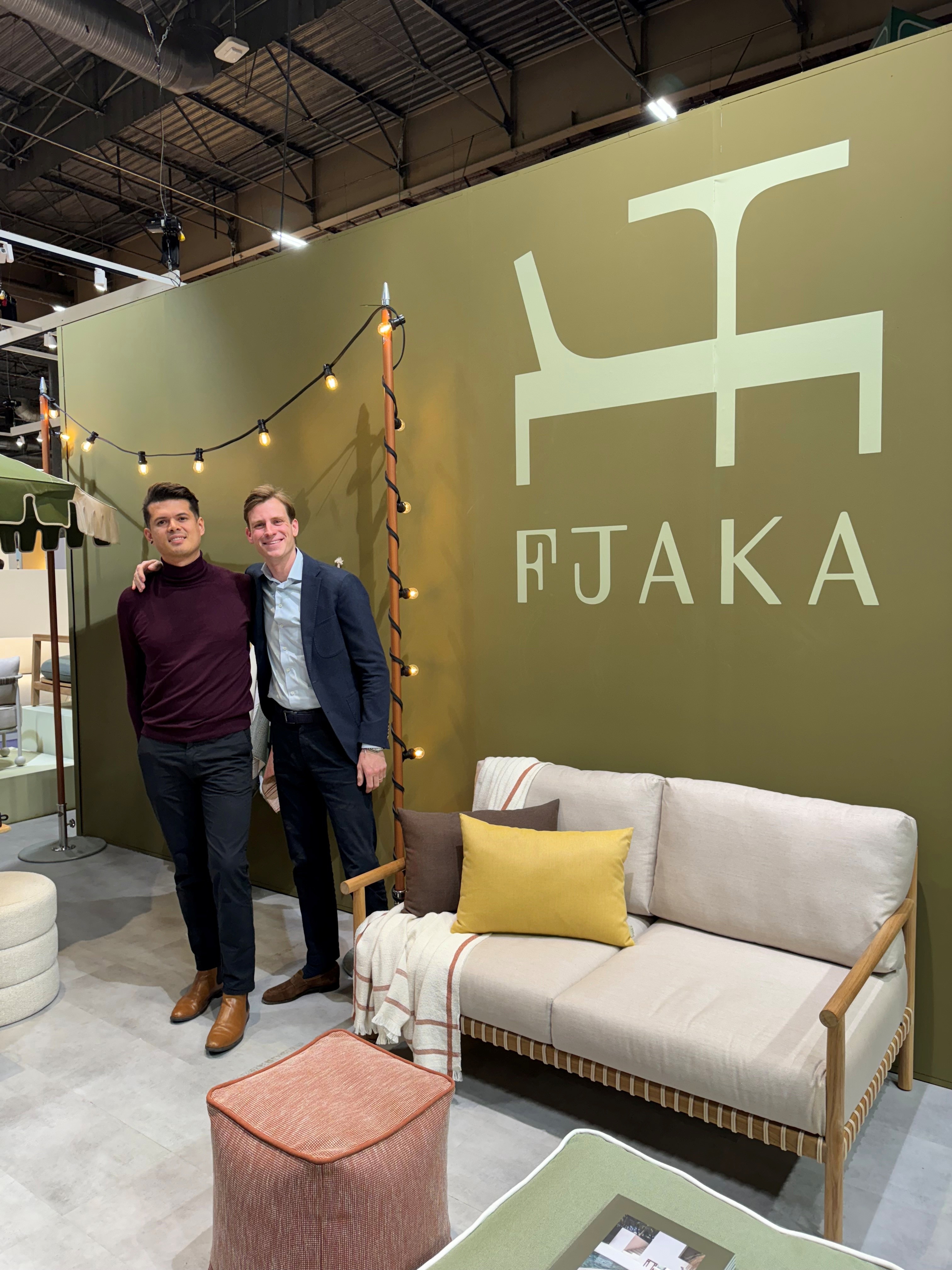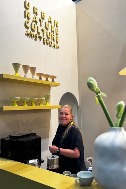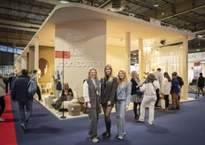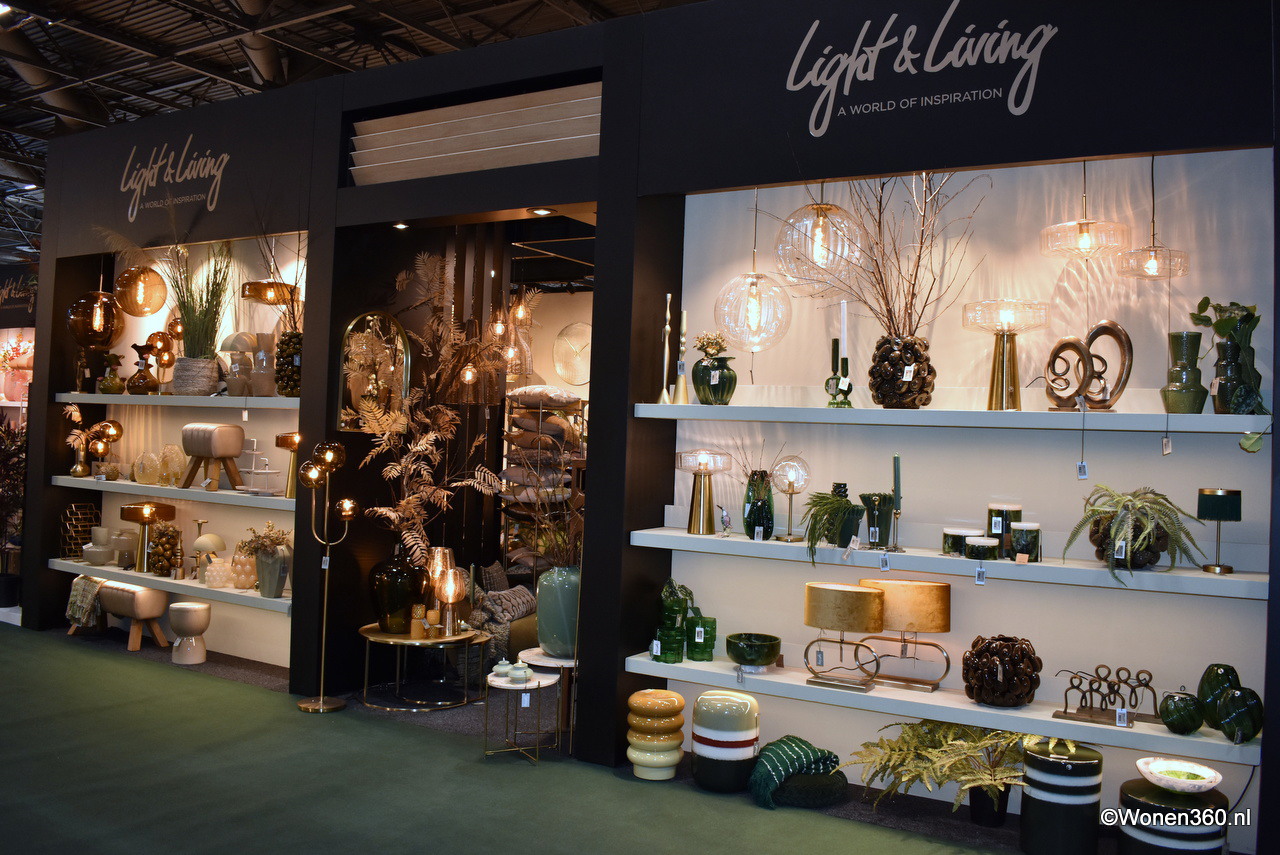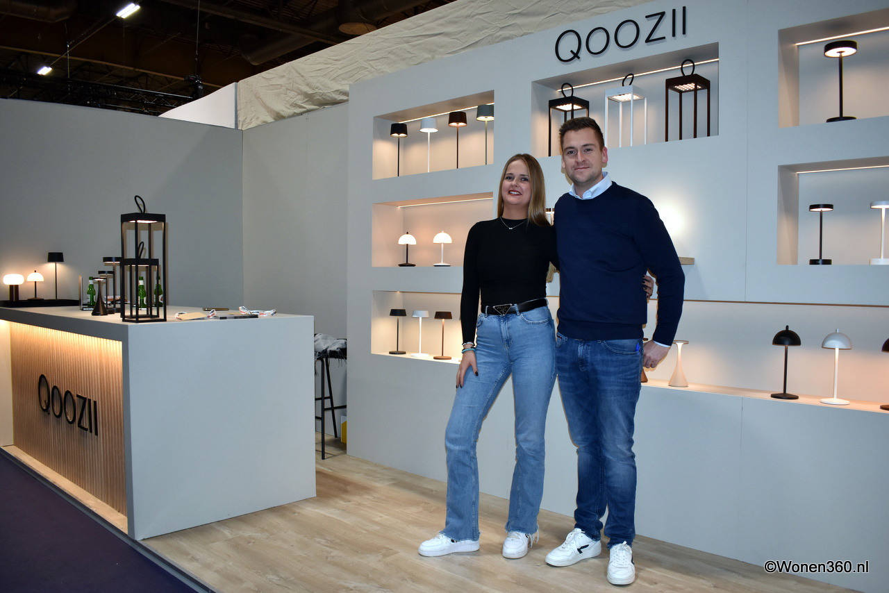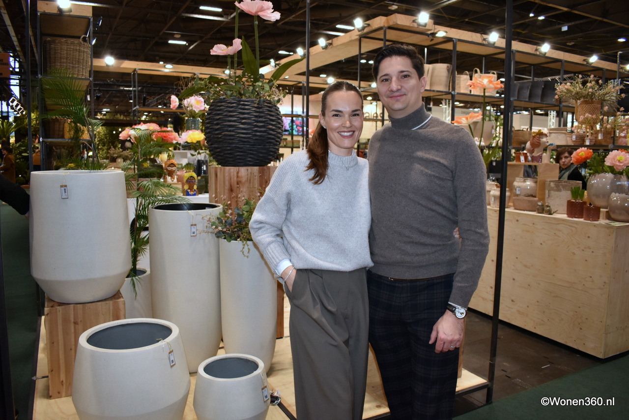 Dunja Wierema en Louise Nolta in de stand van It’s About Romi van GOOD&MOJO, poserend bij de nieuwe collectie lampen gemaakt van duurzame materialen.