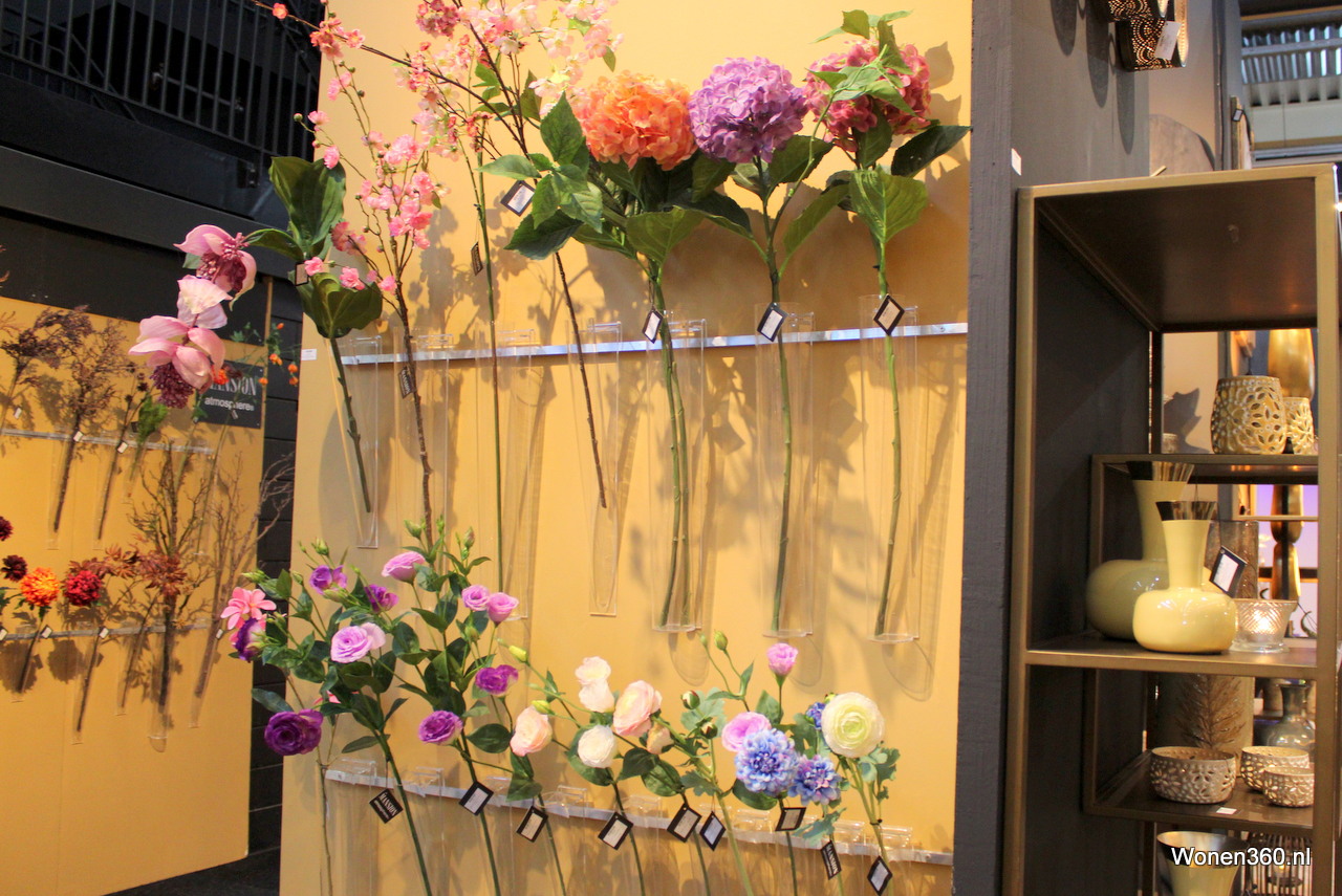 De zijdebloemen collectie wordt gepresenteerd in de kleurrijke woonaccessoires.