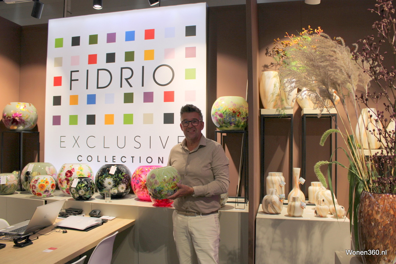 Marcel van Bronkhorst bij de stand van Fidrio met de nieuwe vazencollectie.