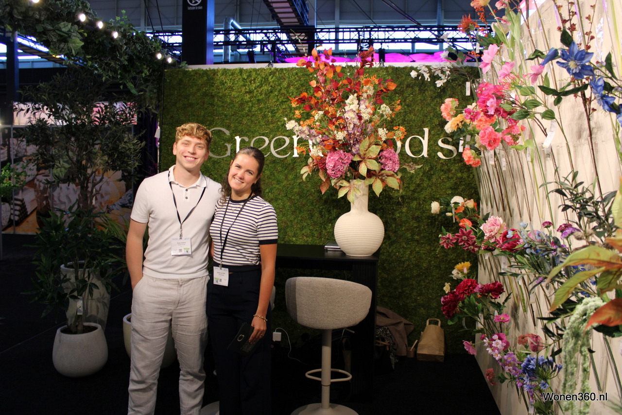 Dennis de Man en Josie van Hoogendam praten bij op de stand van Hoogendam Interiors, By Mooss.
