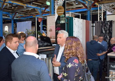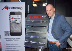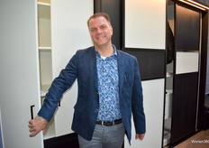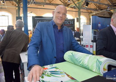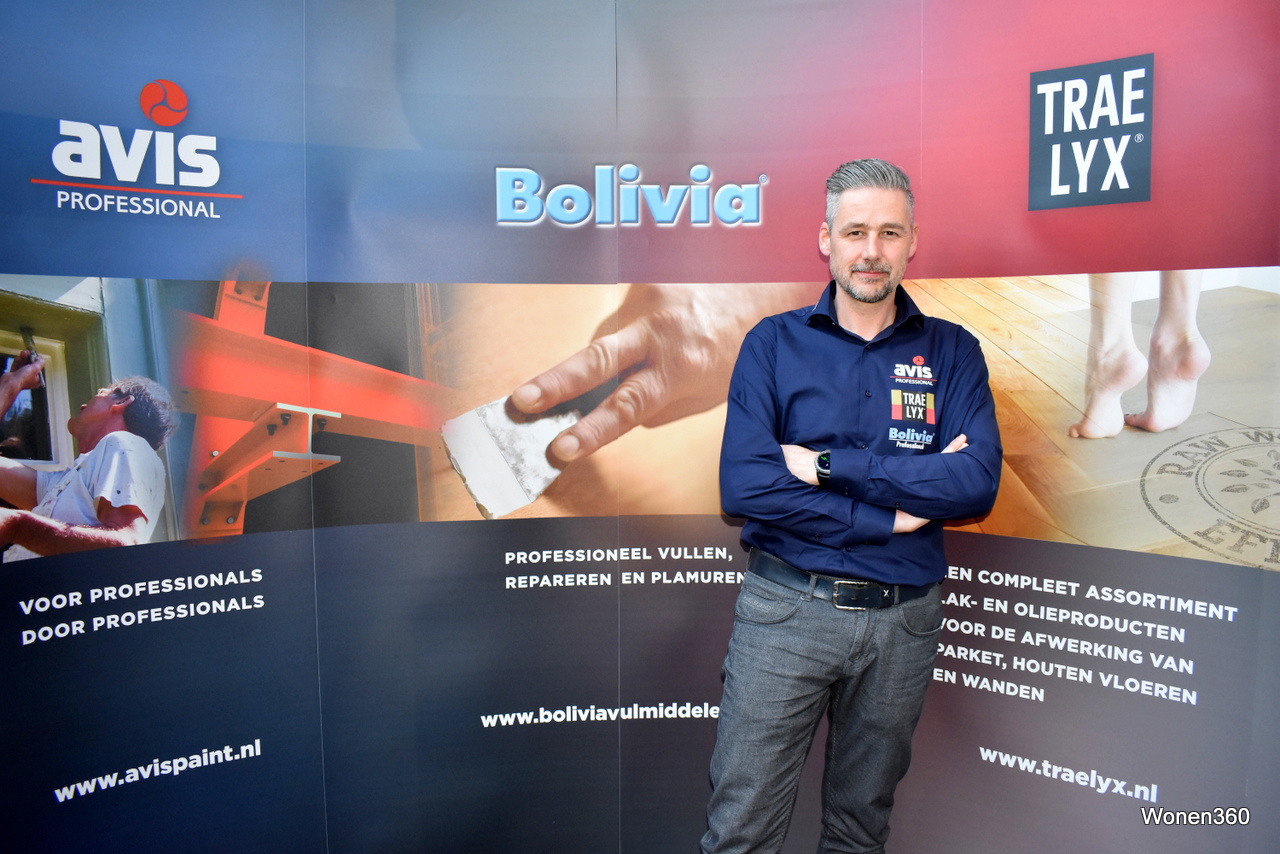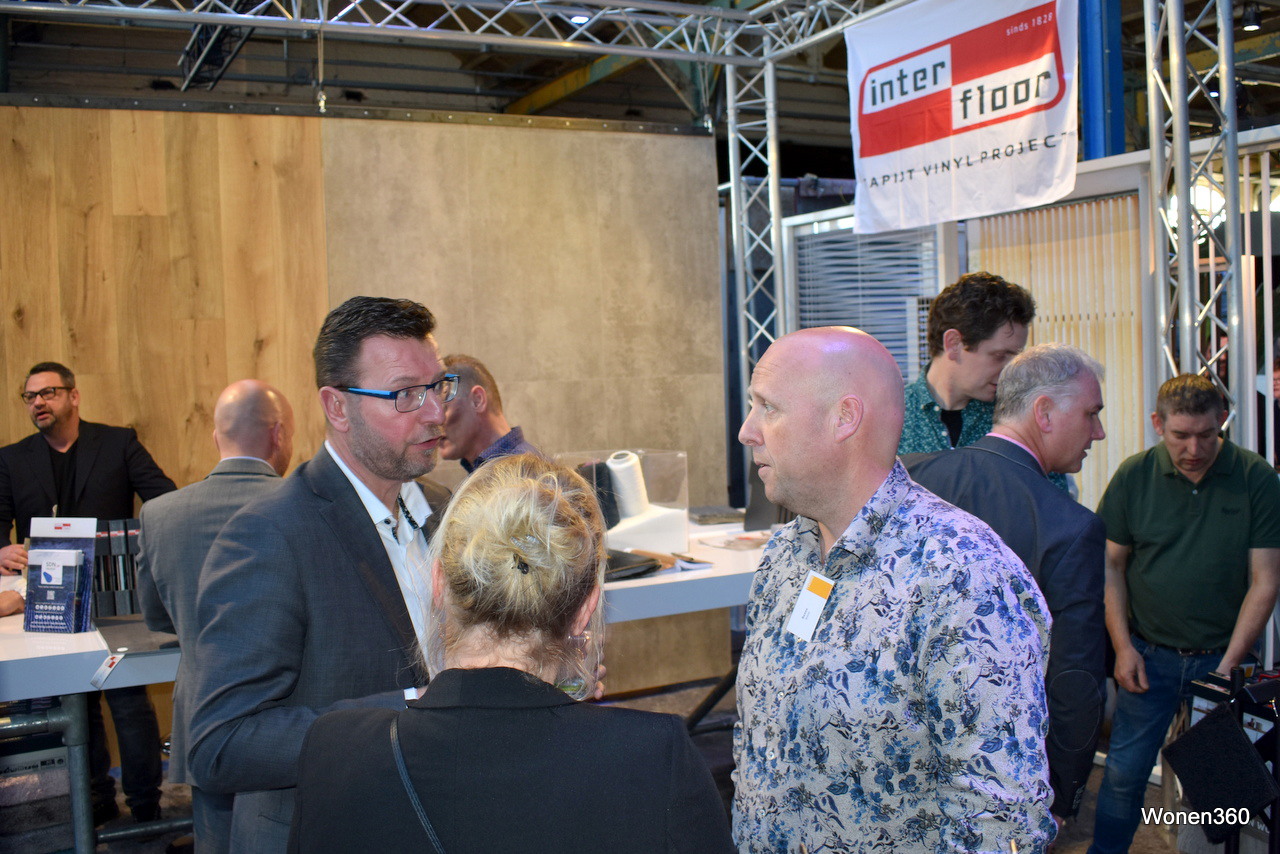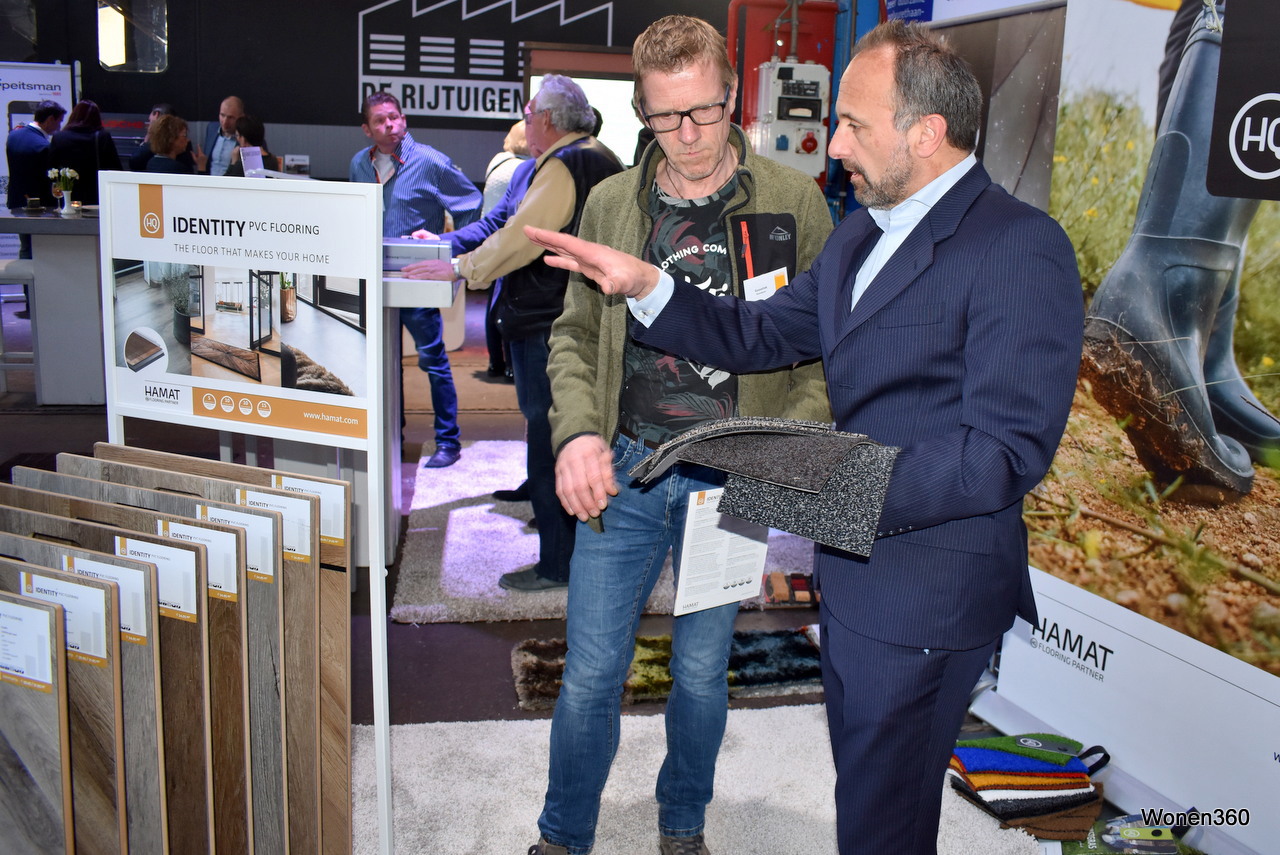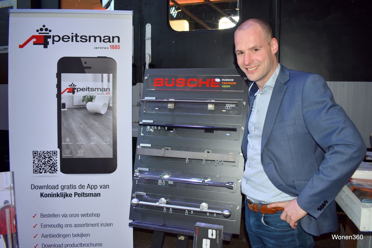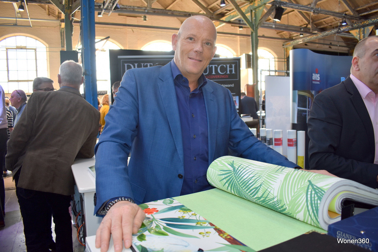 Stefan Damen in de stand van Peitsman, groothandel voor de woninginrichting, projectinrichting en de parketteur.