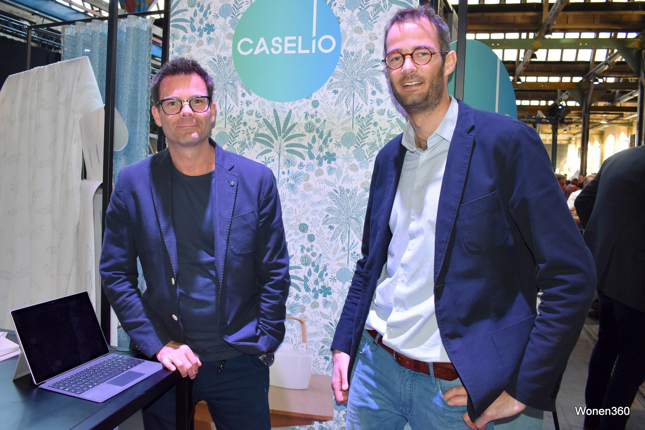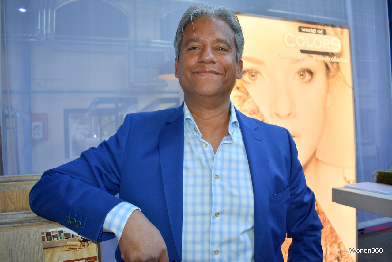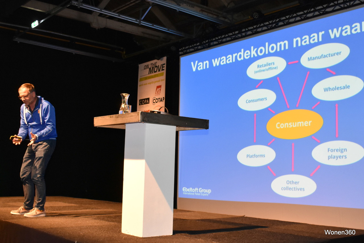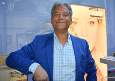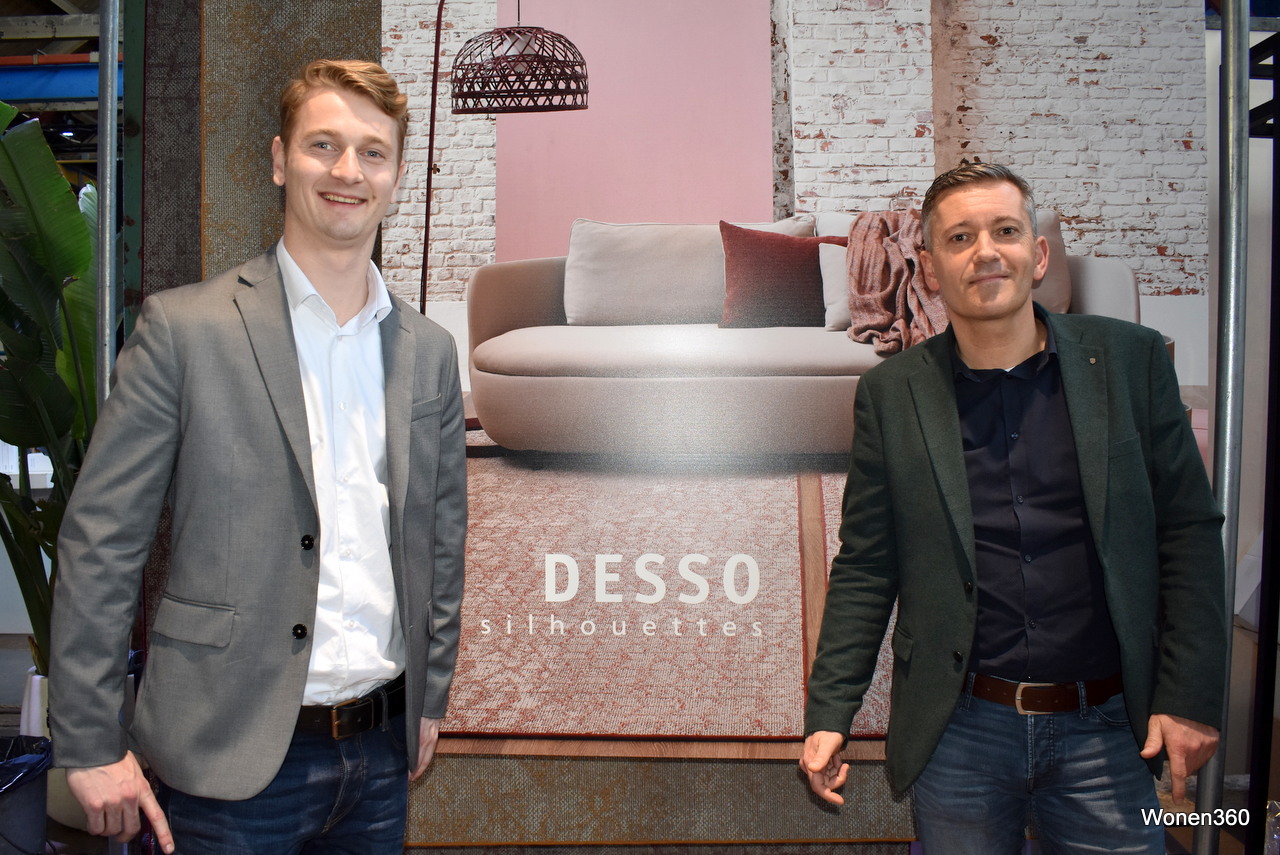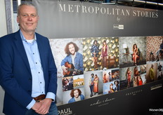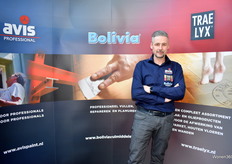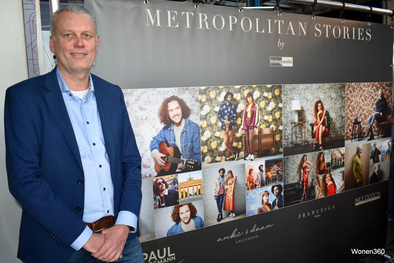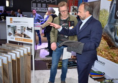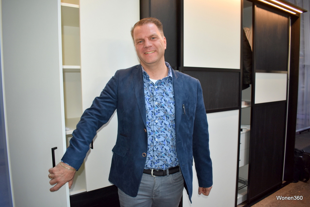Stefan Damen in de stand van Peitsman, groothandel voor de woninginrichting, projectinrichting en de parketteur.