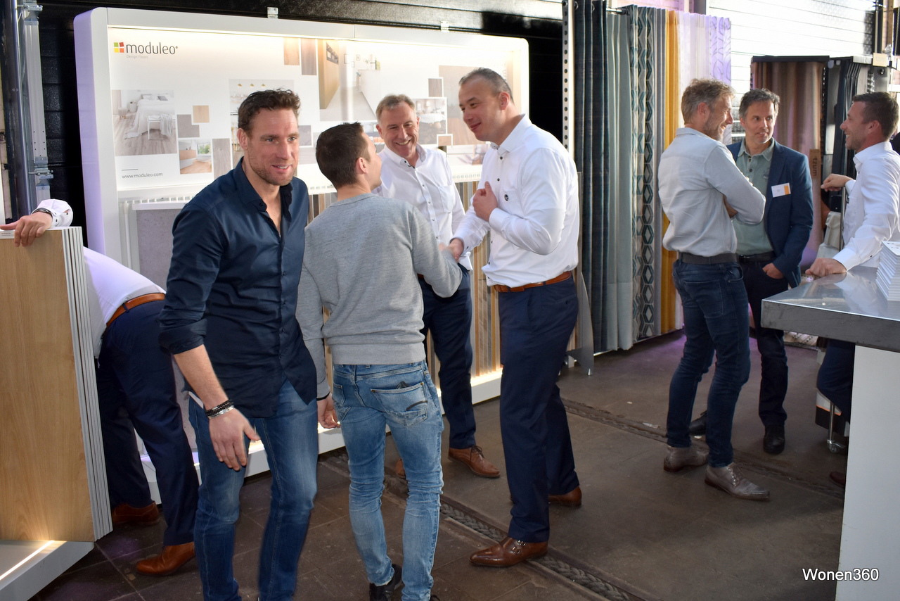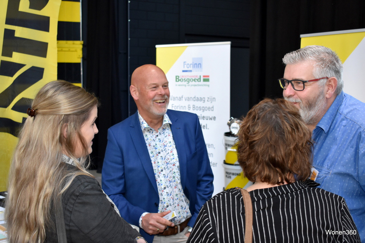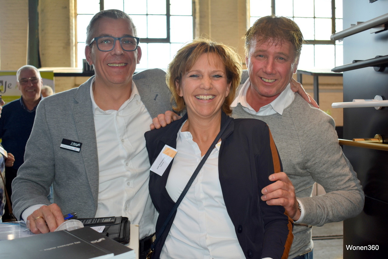 Lachende gezichten in de stand van Forinn (“partner voor vloer en raam”) en Groothandel (in woning en projectinrichting) Bosgoed.