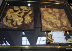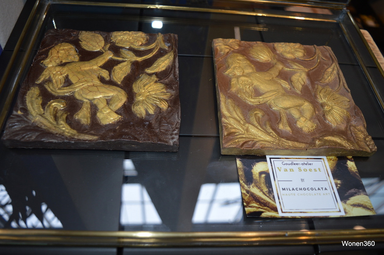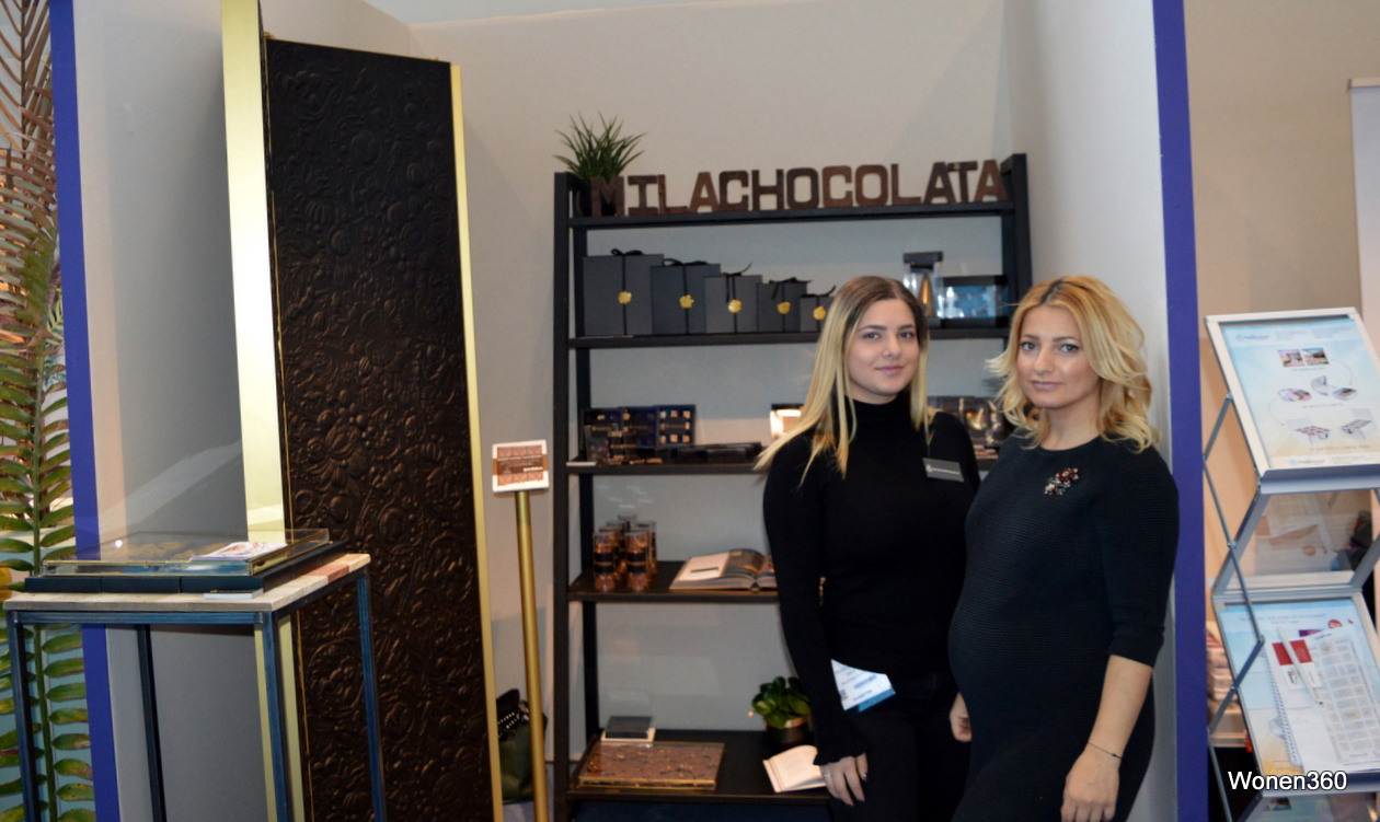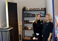 Milena (links) en Anna van Milachocolata. In de stand van het chocolademerk staat een kamerscherm van Gardelux (Hermeta) dat in samenwerking met Sebastiaan van Soest van Goudleer-atelier van Soest is gemaakt. Op de panelen is goudleer aangebracht, Milachocolata heeft een miniatuur versie van het kamerscherm van chocolade gemaakt.