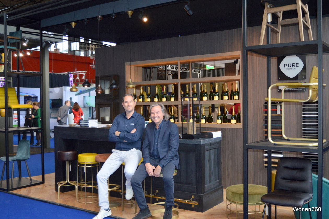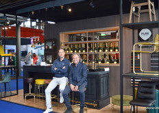 Merijn Alta (links) en Stefan Beek in de stand van Pure Furniture. Het bedrijf maakt authentieke meubels van hout, staal en buffelleer.