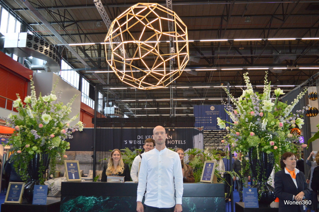 De grote, handgemaakte kroonluchter van Kocowisch, gemaakt van draadframe met geïntegreerde LED-verlichting, sierde de entree van de Independent Hotel Show. Willem Schouten, mede-eigenaar van Kocowisch vertelde met gepaste trots over het ontwerp.