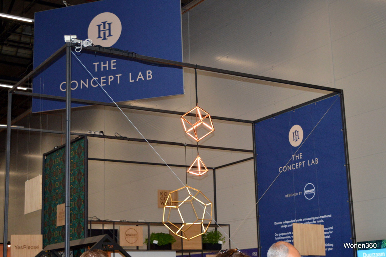 The Concept Lab, ontworpen door Robuust Amsterdam, presenteerde een verzameling van de nieuwste producten, technologie en hypermodern design. Op de voorgrond enkele lampen van Kocowisch.