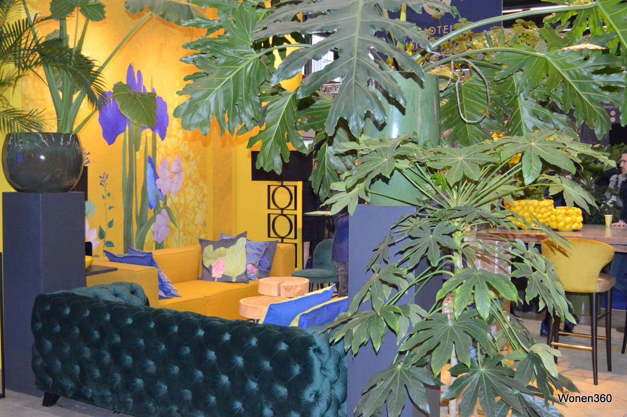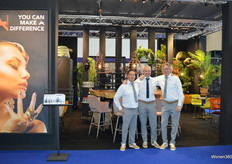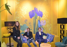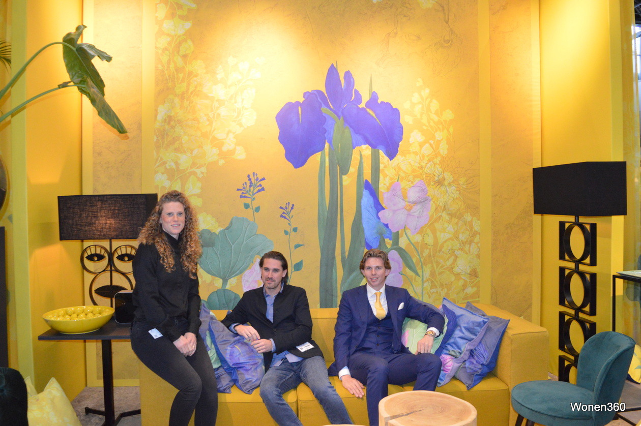 Eva, Ronald en Mitch in de kleurrijke stand van ESTIDA, specialist in interieurdesign voor hotels en horeca.