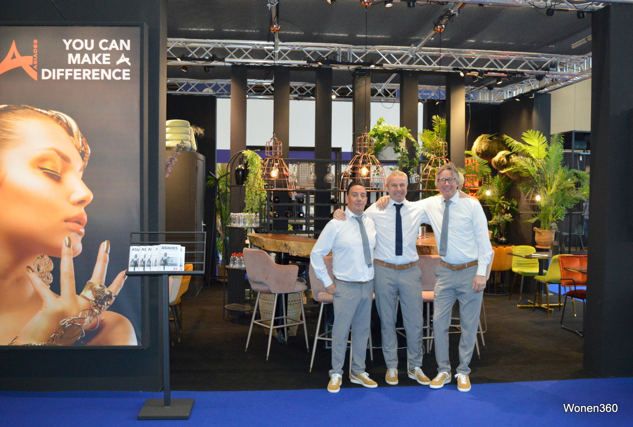 V.l.n.r. Wilfred, Jan-wout en Alphons in de stijlvol ingerichte stand van Asiades. Het bedrijf ontwerpt, ontwikkelt en produceert eet- en loungemeubels in Azië.