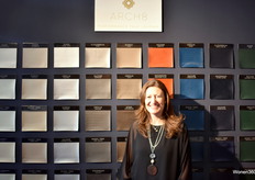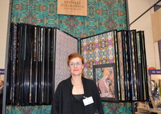Marcella in de stand van Prints van Oranje, het bedrijf print alles op textiel, van gordijnen tot behang en vloeren.