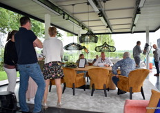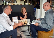 Sander de Weijer (links) en Angela Heeren van Raw Next in Breda in een plezierig onderonsje met salesagent Henri Schepers.