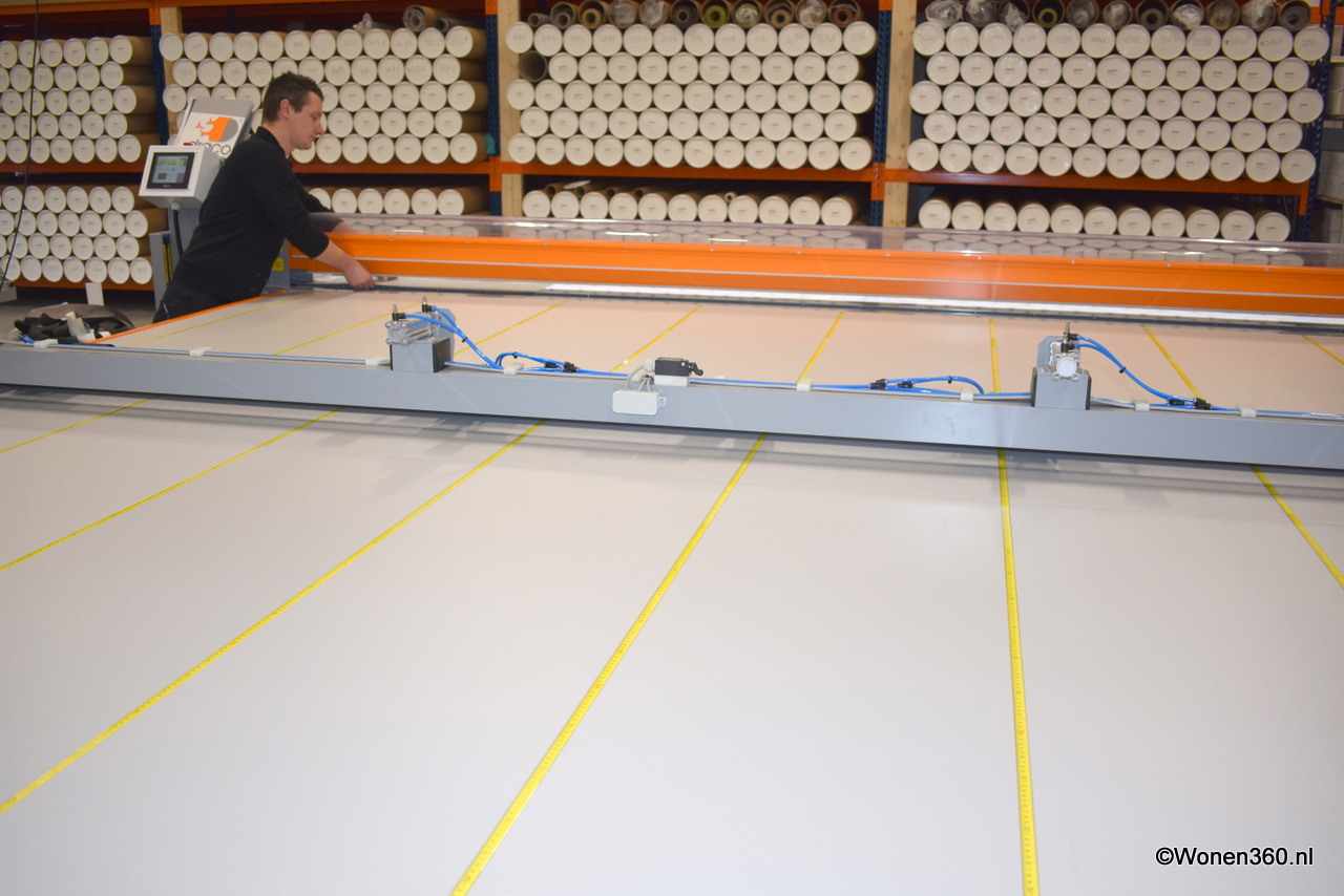 Doeken worden met deze machine volautomatisch op maat gesneden.