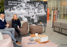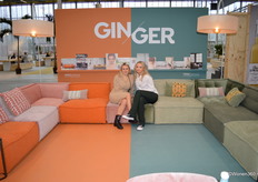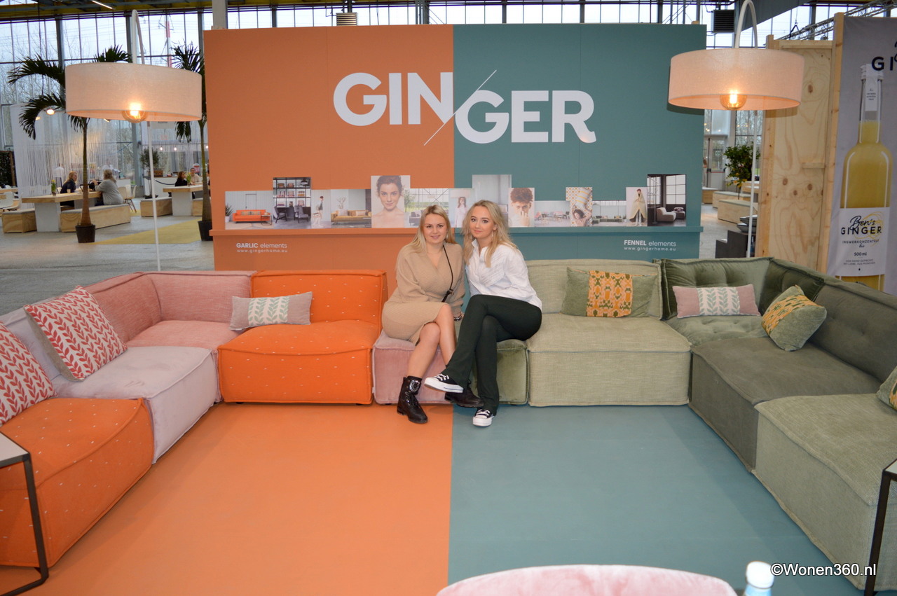 Renee en Benthe showen de zithoekopstelling van Ginger, bestaande uit 9 elementen. Als gimmick is de stand opgedeeld in twee kleuren. "Wij maken kwaliteitsmeubels met pittige keuzes. Anders, met nieuwe perspectieven. Pittig, niet te serieus en soms een beetje dwars. Geen rage, maar een modieuze metgezel voor het leven."