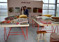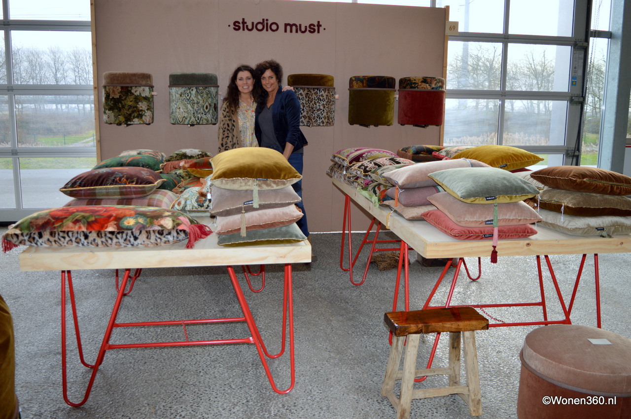 De dames Gemke en Erica bij de mooie kussens en poefs van Studio Must, alle producten zijn voorzien van fluweelachtige, rijke stoffen.