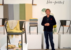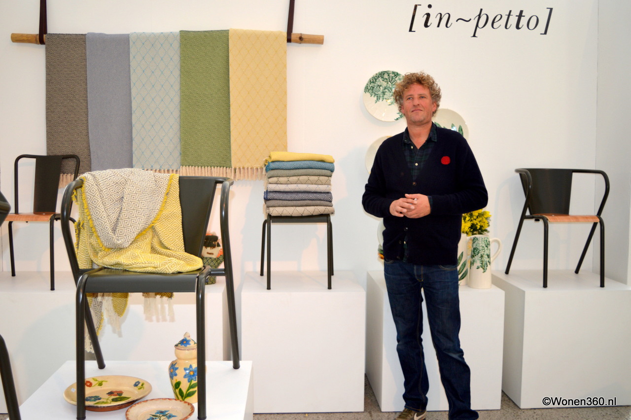 Ronald Lubberhuizen bij de kleurige dekens in de stand van groothandel In-Petto, ook verkopen ze kleurrijk geglazuurd aardewerk uit Portugal.