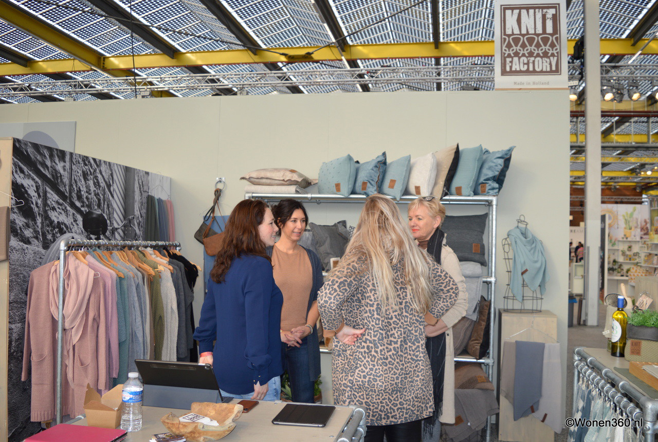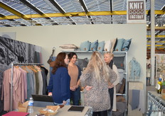 Madelon (blauwe blouse) druk in gesprek met klanten in de stand van Knit Factory.