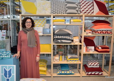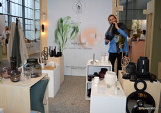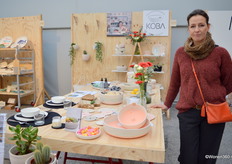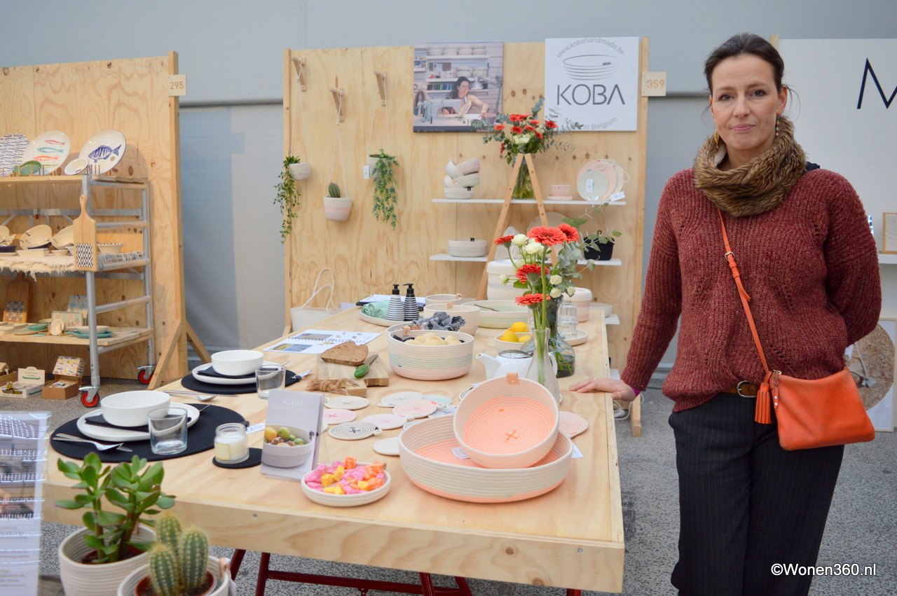 Peggy Mes in de stand van Onshus, het merk verkoopt allerlei woonaccessoires van glaswerk, keramiek en textiel.