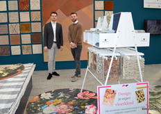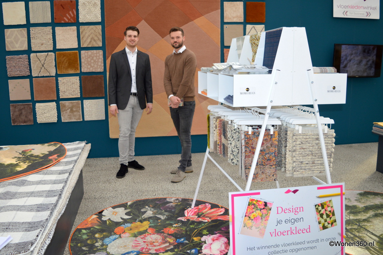Erjan Nahuys en Marco Groen in de stand van de Vloerkledenwinkel, ze verkopen hand- geweven, geknoopte en getufte vloerkleden en tapijten van diverse merken.