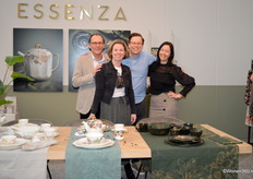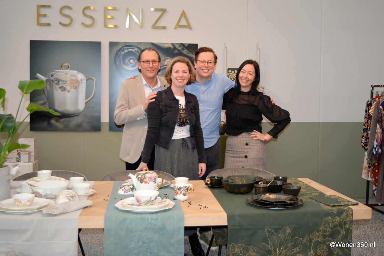 Edgar Rijnders, Nicole Bakker, Paul van der Wolk, en Astrid Bauer in de fleurige stand van Essenza. Het merk presenteerde haar eerste servies- en linnencollectie.