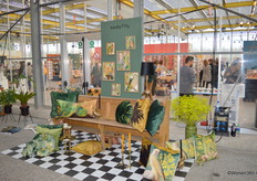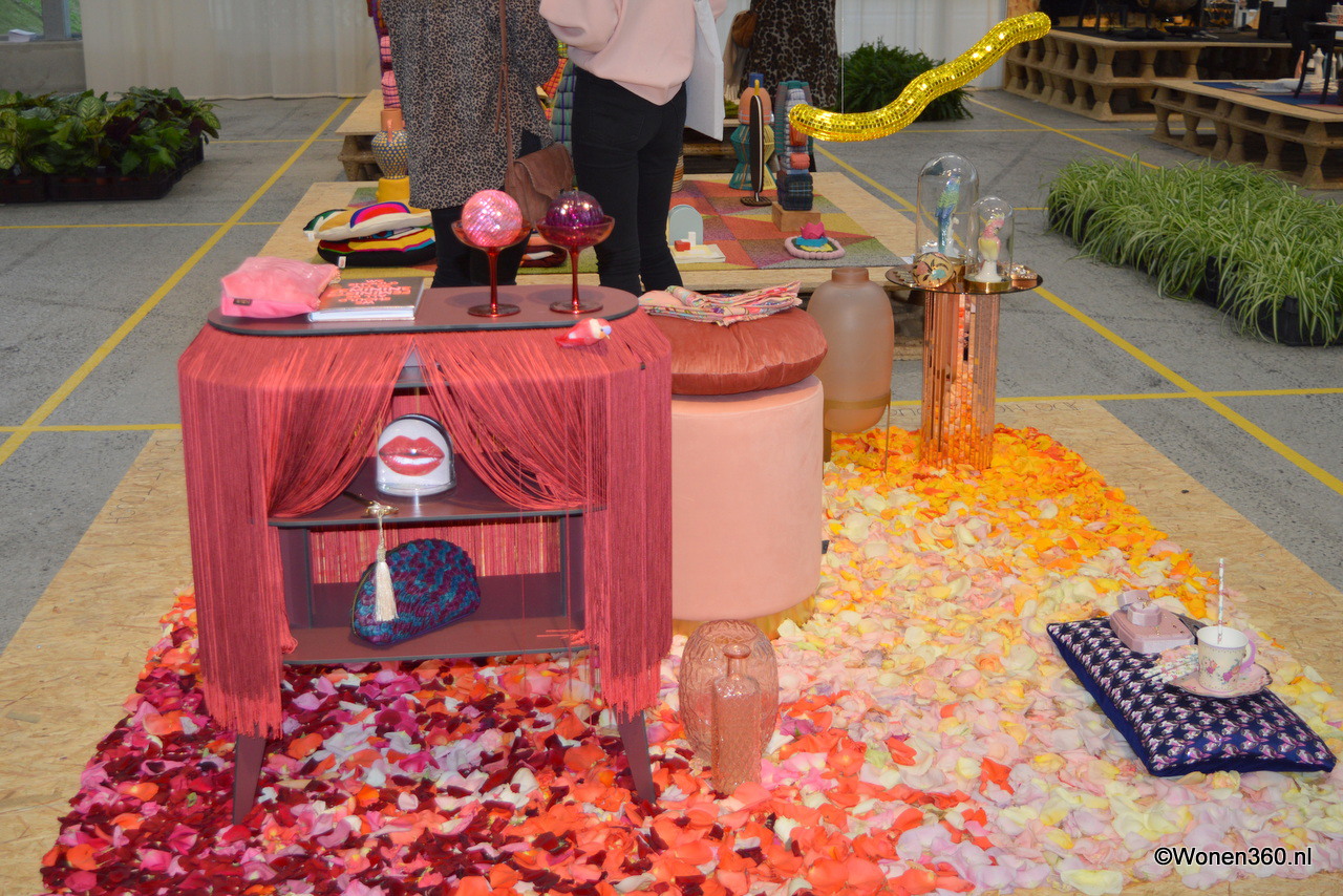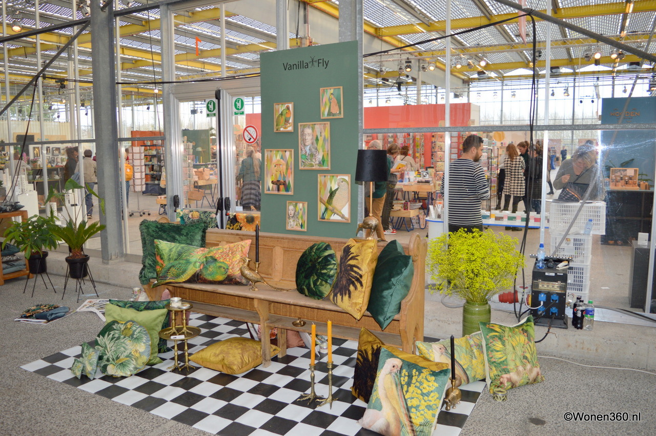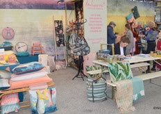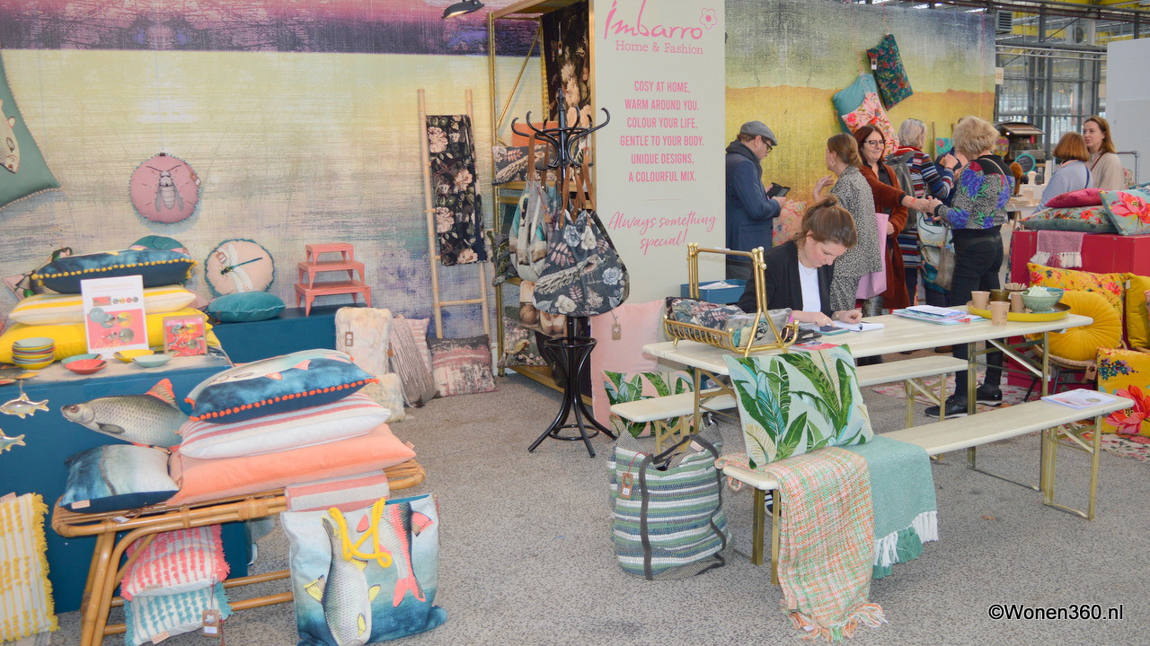 Kleurige kussens, plaids en accessoires in de stand van Imbarro.