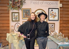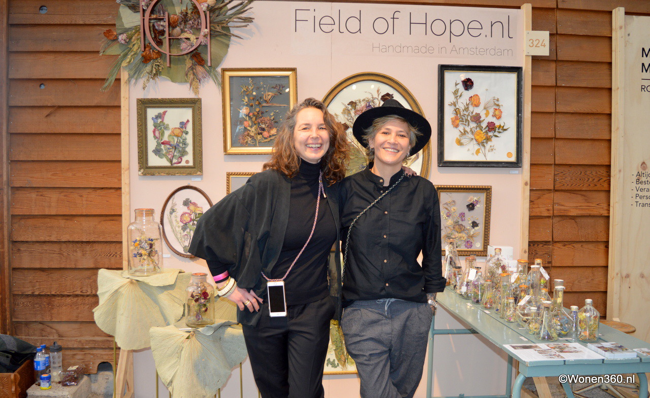 Hariatie Eleveld (l) en Danielle Kortekaas van Field of Hope maken samengestelde sets van gedroogde bloemen, grassen en (on)kruid verwerkt in vintage lijsten of glas.