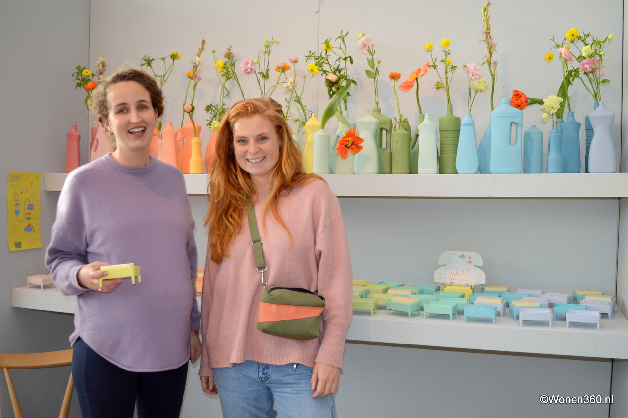 Foekje Fleur van Duin en Charlotte van Iwaarden in de kleurrijke stand van Foekje Fleur. Eigenaresse Foekje ontdekte wat plasticvervuiling met onze omgeving doet. Dit inspireerde haar om Bubble Buddy te ontwerpen, een hulpmiddel dat helpt bij het verminderen van het plastic afval dat we creëren.