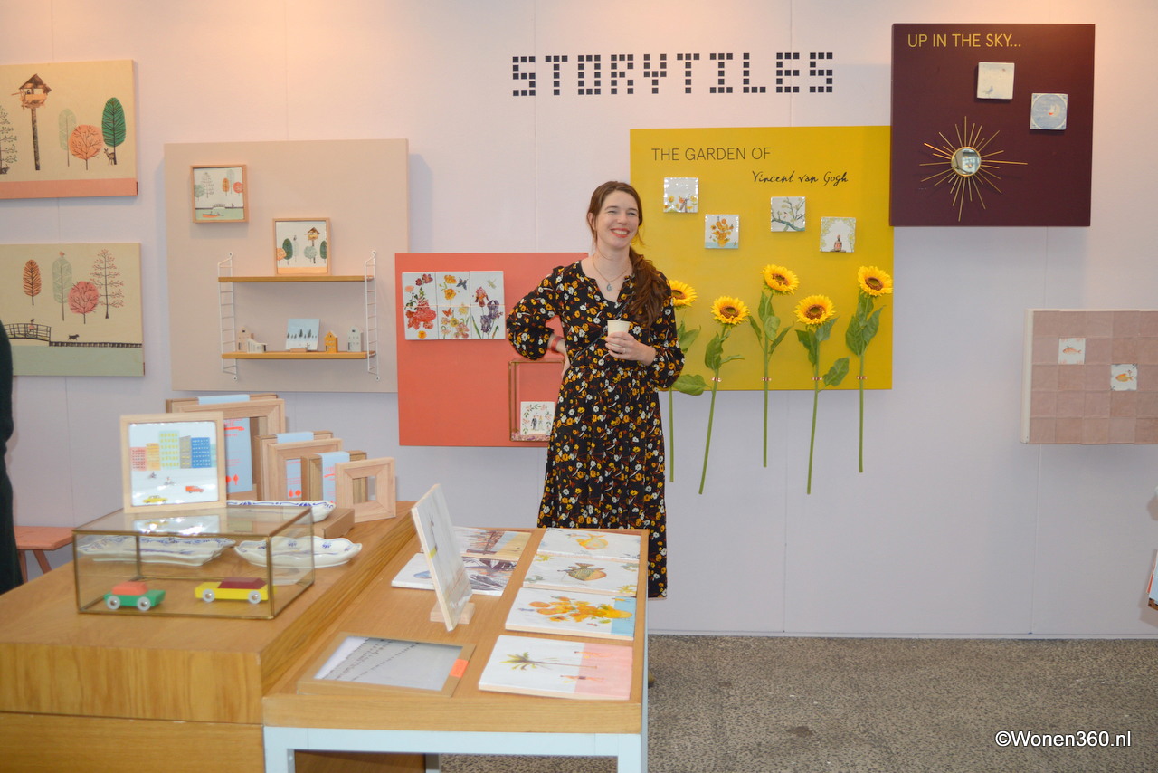 StoryTiles maakt kunst op tegels, hout en borden. Elk design heeft een grappige twist, waarin klassieke concepten contrasteren met modern elementen. Alle StoryTiles producten worden ambachtelijk gemaakt in Nederland. Op de foto eigenaresse Marga van Oers.