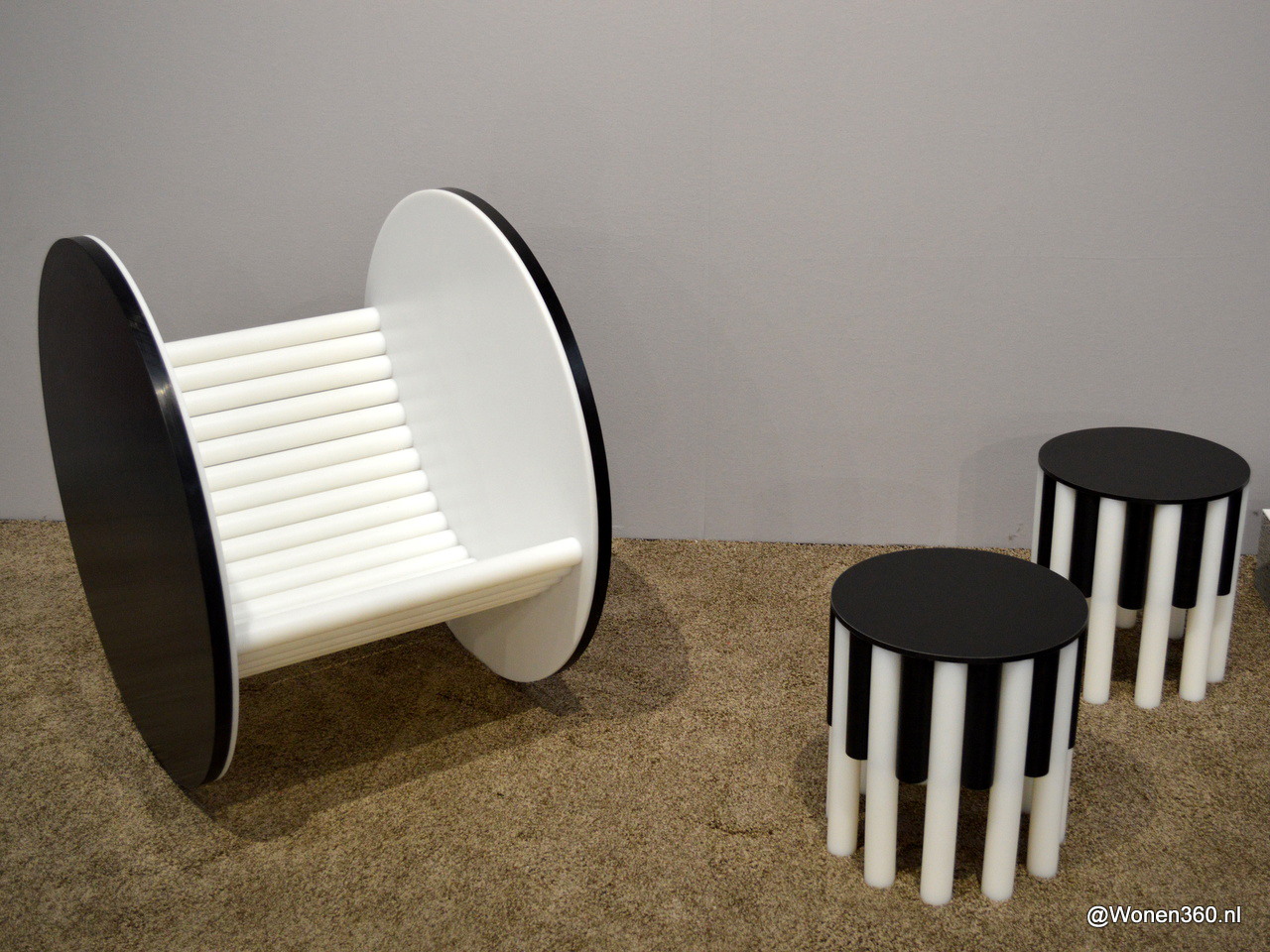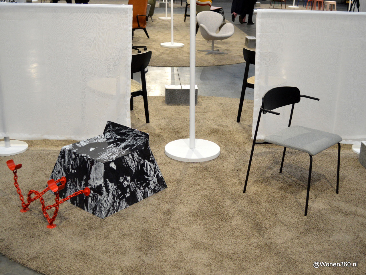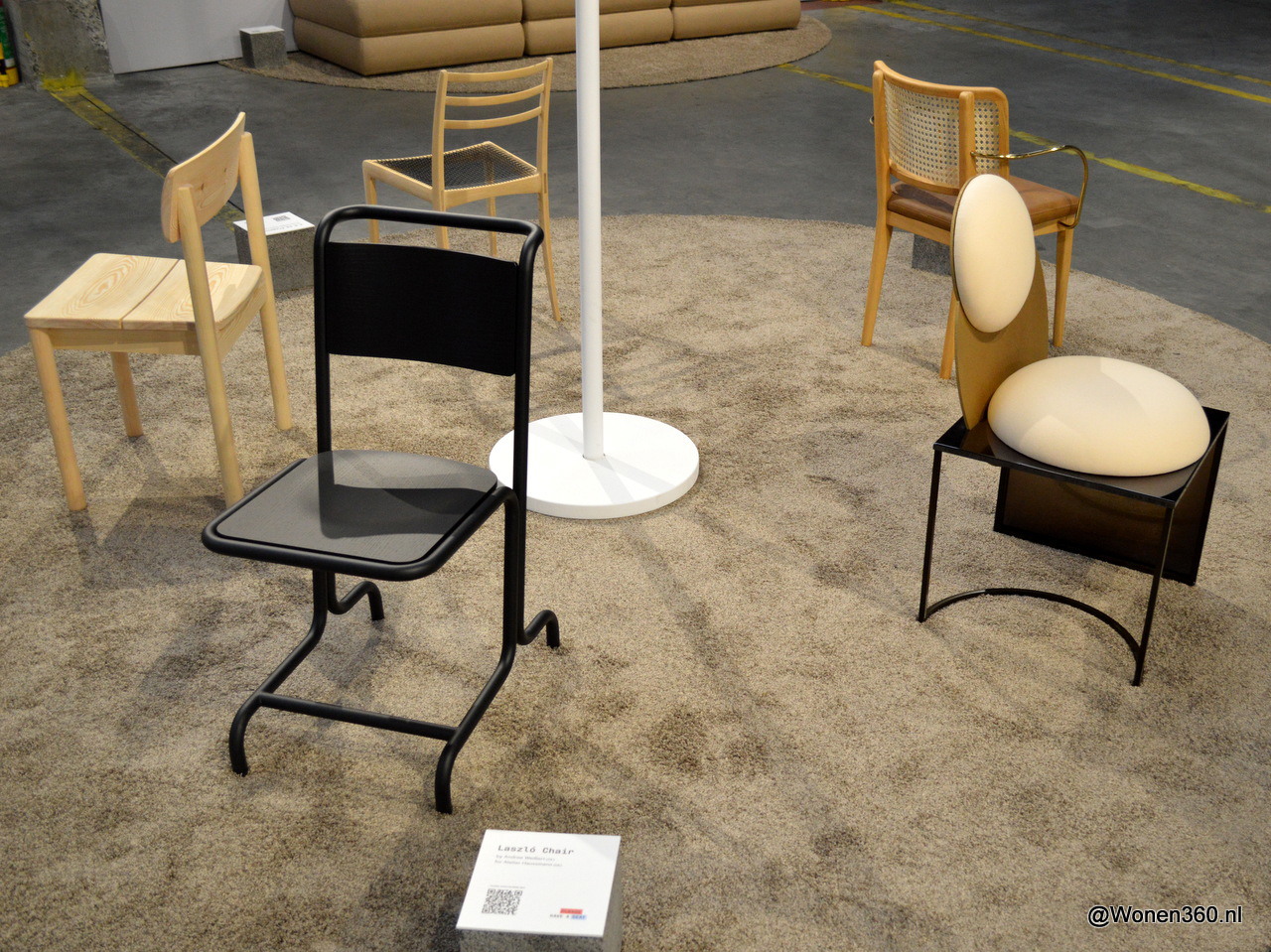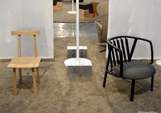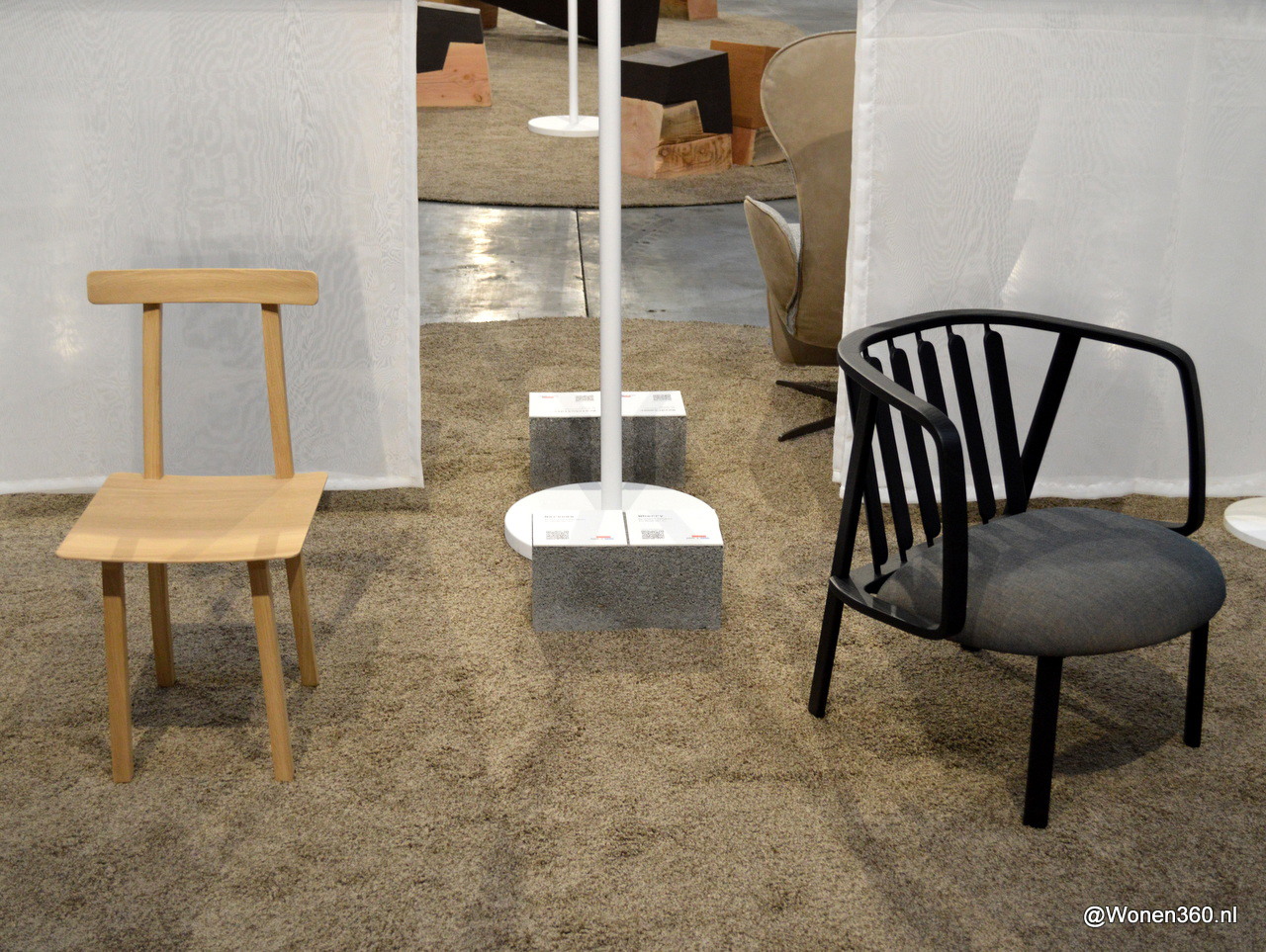 Rechts de Prometheus Unbound door Edvin Klasson voor zijn eigen merk en rechts de Peak Chair van Occony ontworpen door Joost van der Vecht.