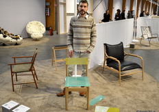 Thomas Litiere achter zijn eigen ontworpen stoel. De gekleurde zitting en rugleuning kunnen van kleur verwisseld worden.