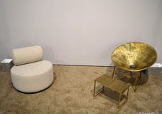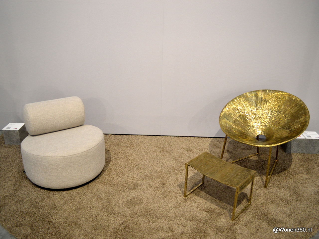 Links model Sinclai van meubelmerk FEST met een gouden stoel met voetenbankje ontworpen door Isabelle de Borchgrave.