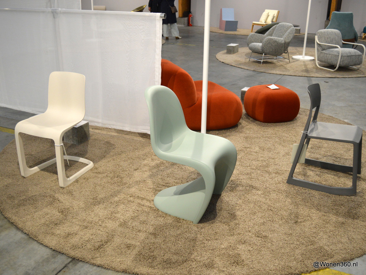 Drie herkenbare modellen van Vitra. V.l.n.r. EVO-C. Panton Chair en Tip Ton RE.
