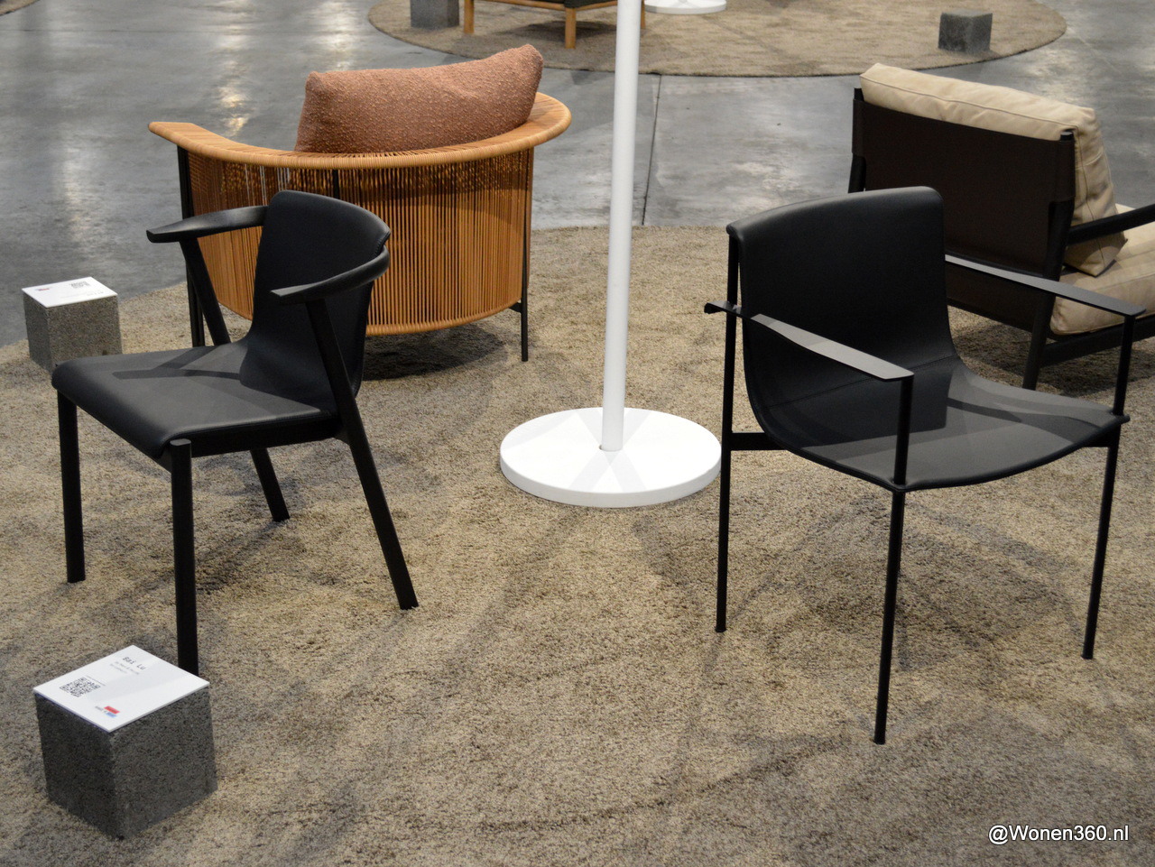 Links model Bazaar van Kiosk deluxe en rechts de Band Dining Armchair voor Kettal.
