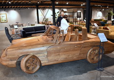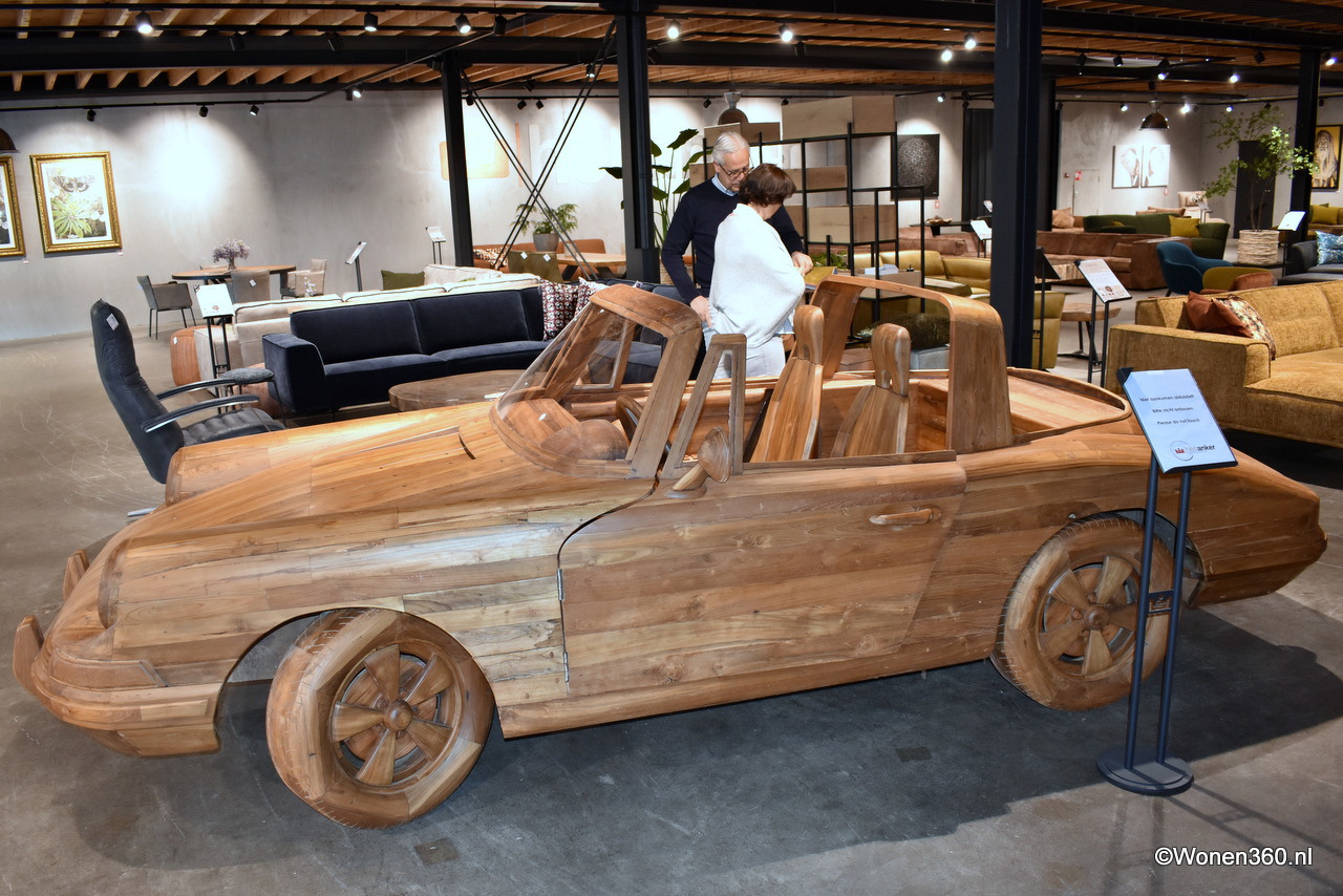 Een houten Porsche op ware grootte siert de showroom in Druten.
