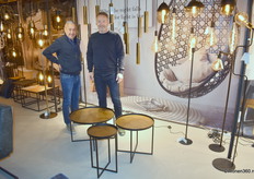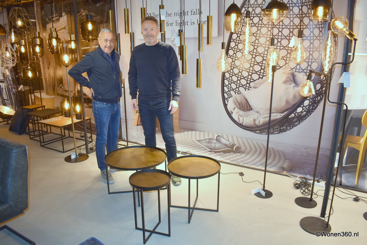 De accountmanagers Marc Kouters en Remco van Woudenberg van Masterlight. De producent en tevens groothandel uit Panningen toont haar kwalitatieve designverlichting. Op de voorgrond de sidetables, deze zijn nieuw in het assortiment