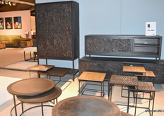 Bijzettafels in verschillende vormen en maten, met op de achtergrond kasten uit de Carving Collection.
